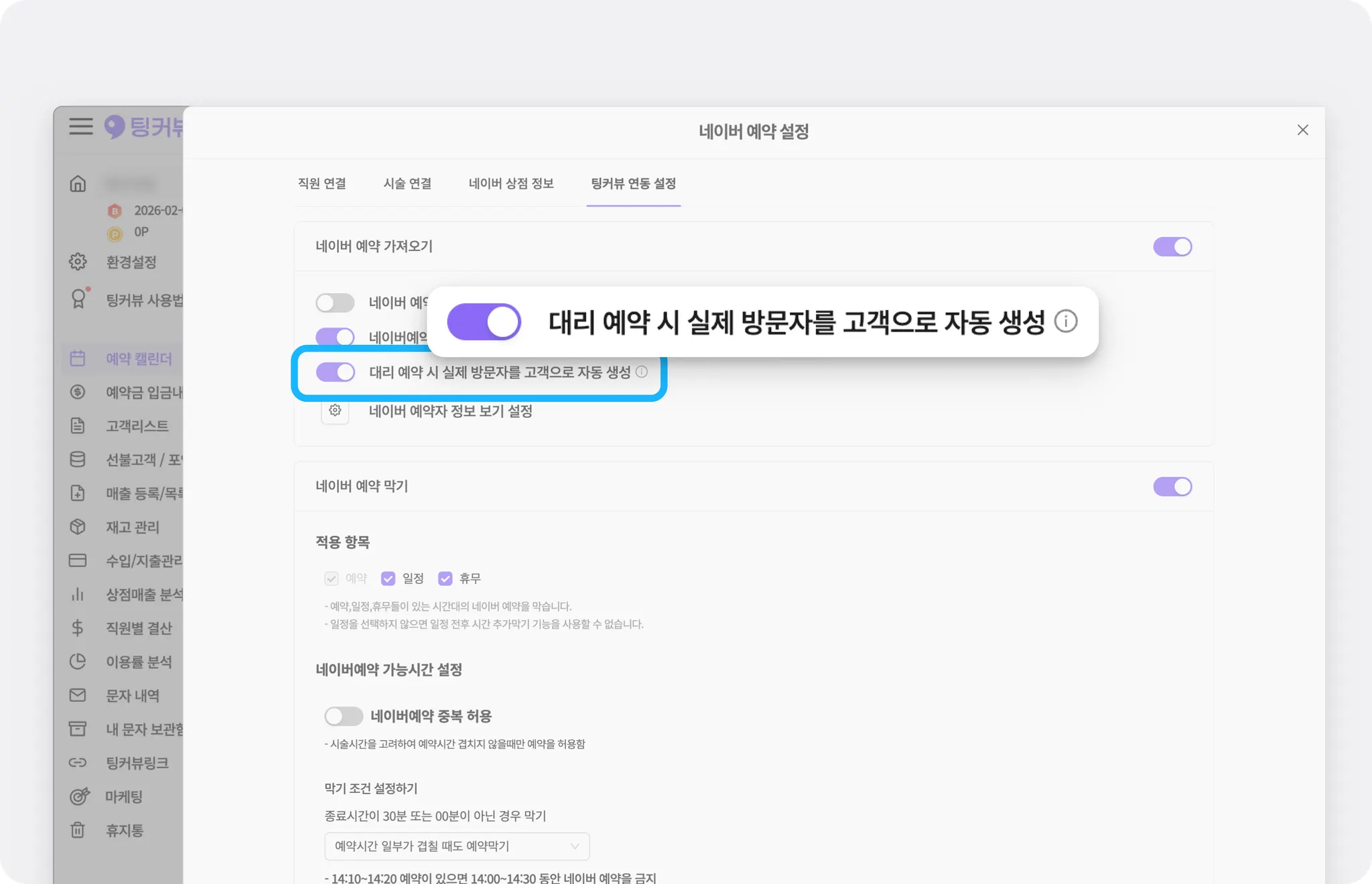 [네이버 예약 설정] - [팅커뷰 연동 설정] - [네이버 예약 가져오기] - [대리 예약 시 실제 방문자를 고객으로 자동 생성] 을 비활성 상태로 설정하면 예약자를 예약 고객으로 생성해요.