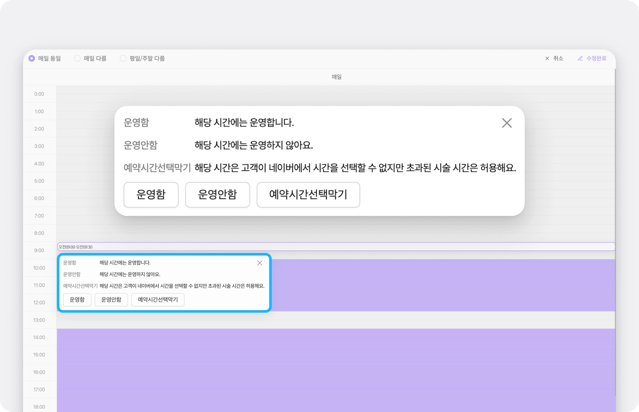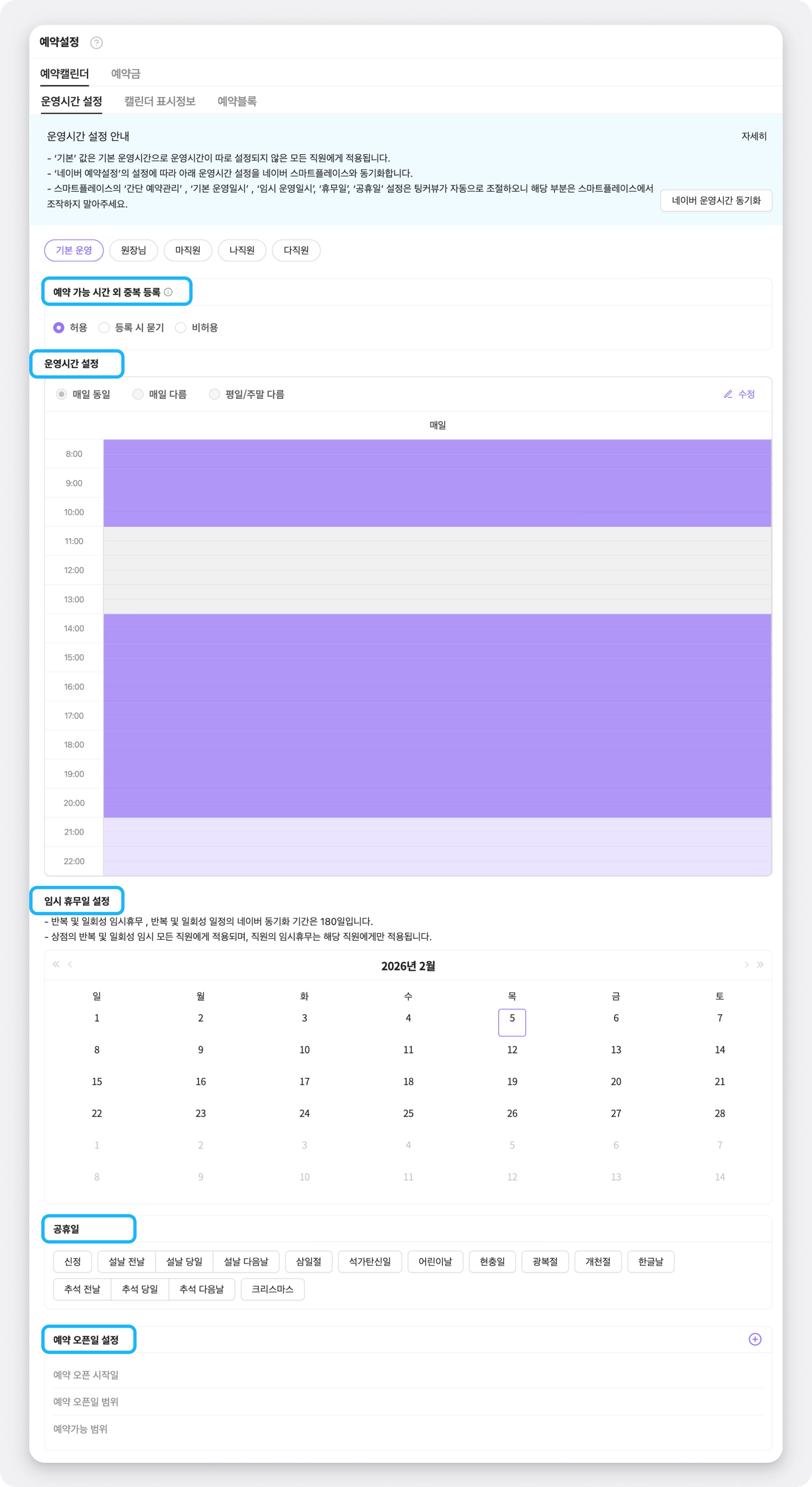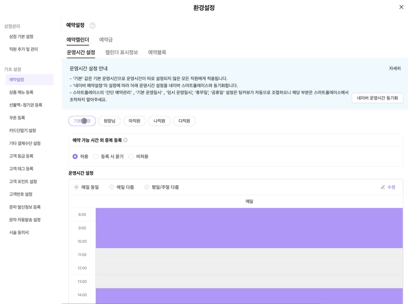 ‘네이버 예약설정’의 설정에 따라 아래 운영시간 설정을 네이버 스마트플레이스와 동기화합니다.