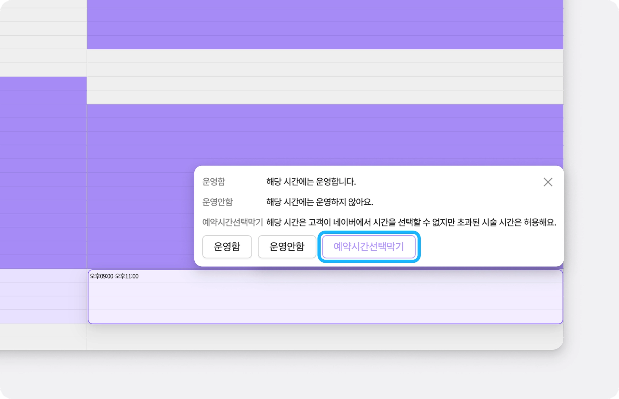 "해당 시간은 고객이 네이버에서 시간을 선택할 수 없지만, 앞 타임 예약의 초과된 시술 시간은 허용해요." (새로운 예약 시작은 막고, 앞서 잡힌 예약의 시술이 길어져서 이 시간까지 이어지는 것은 가능합니다.)