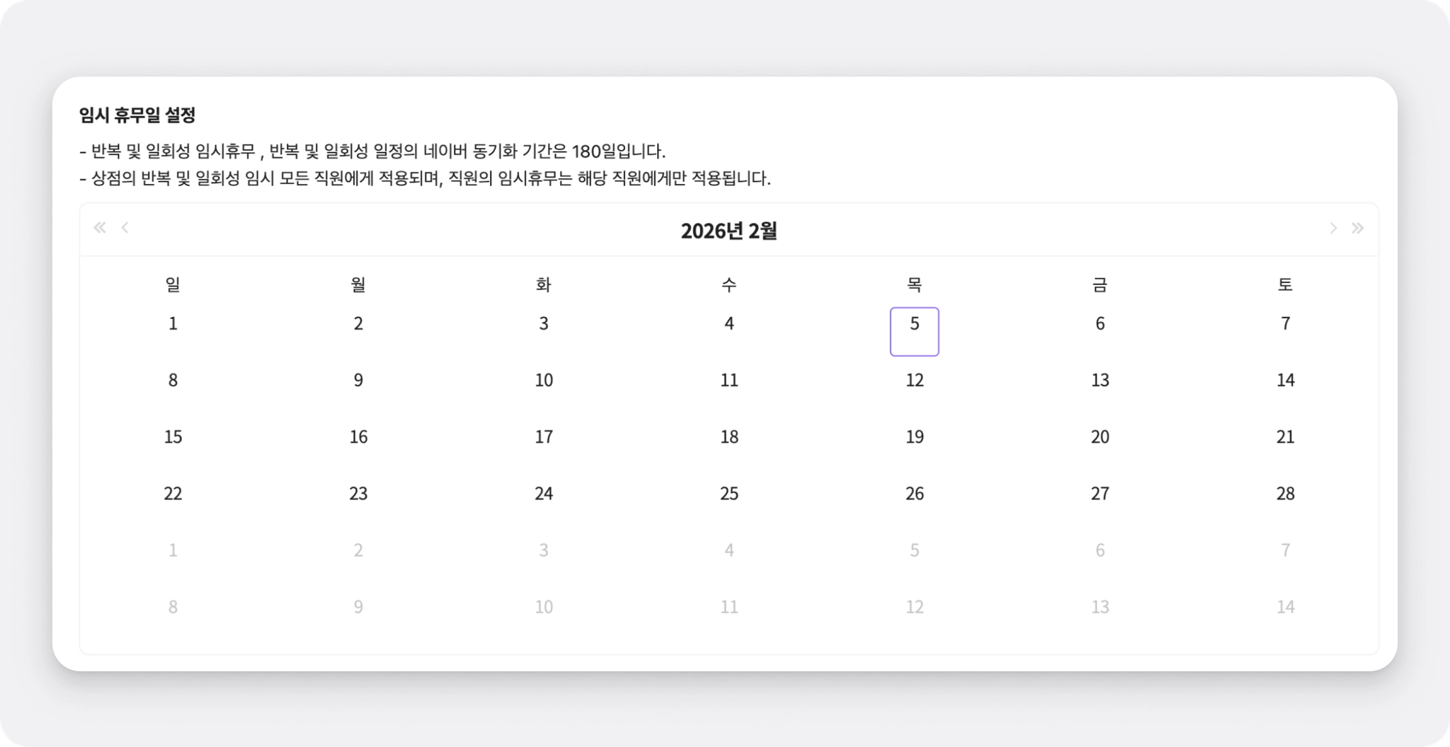 이제는 반복 일정, 임시 휴무, 일회성 일정 등 모든 스케줄이 최대 180일(약 6개월)까지 네이버에 자동으로 넉넉하게 연동돼요.