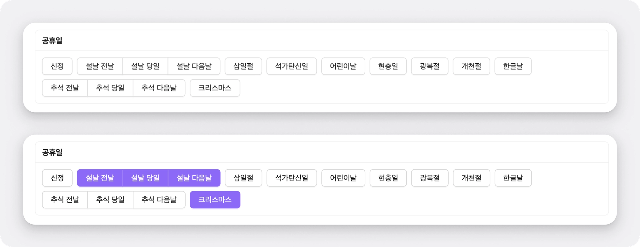 공휴일에 대한 휴무 설정도 미리할 수 있어요. 공휴일 휴무 또한 상점 전체, 직원별로 설정해 보세요!