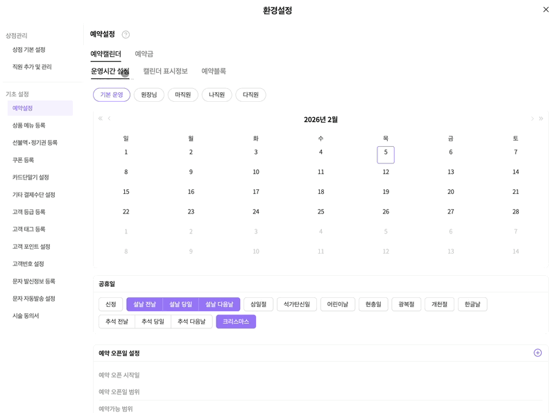 운영시간 설정 | 상점 전체/직원별 설정 가능, 매일 동일/매일다름/평일,주말 다름 설정 가능 |