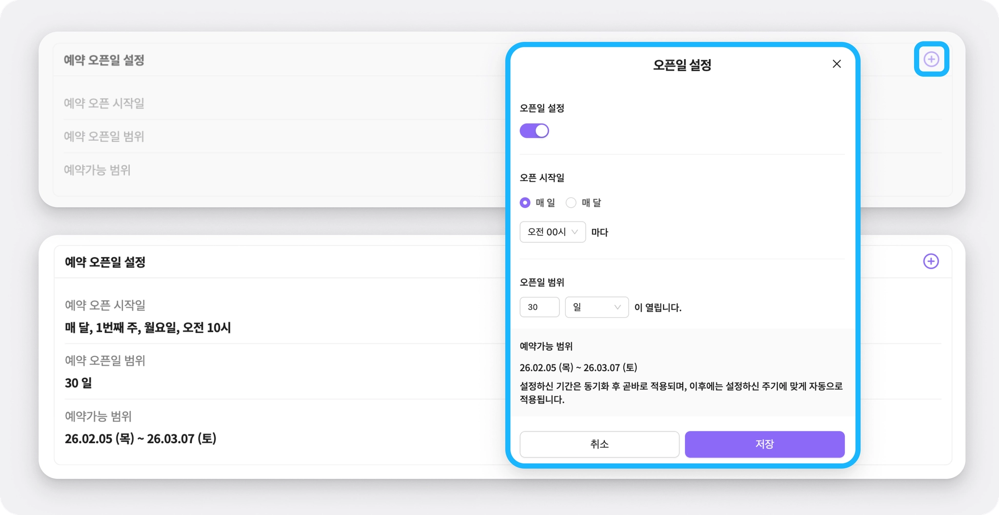 고객에게 예약창이 열리는 시기를 지정해 주세요. 상시 예약을 받지 않고, 특정 기간 단위로 예약을 오픈하고 싶을 때 유용해요!