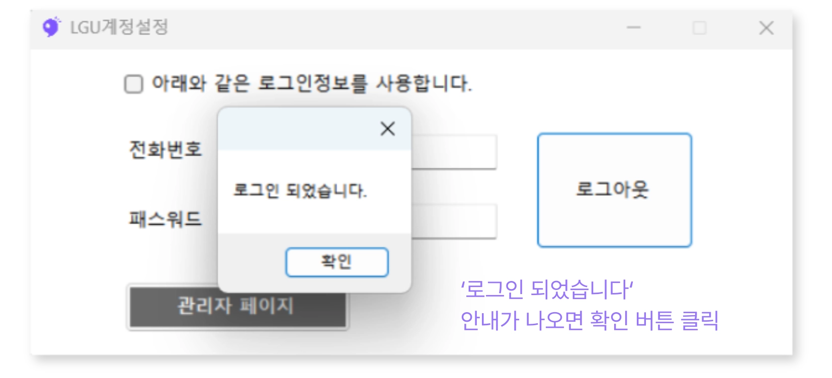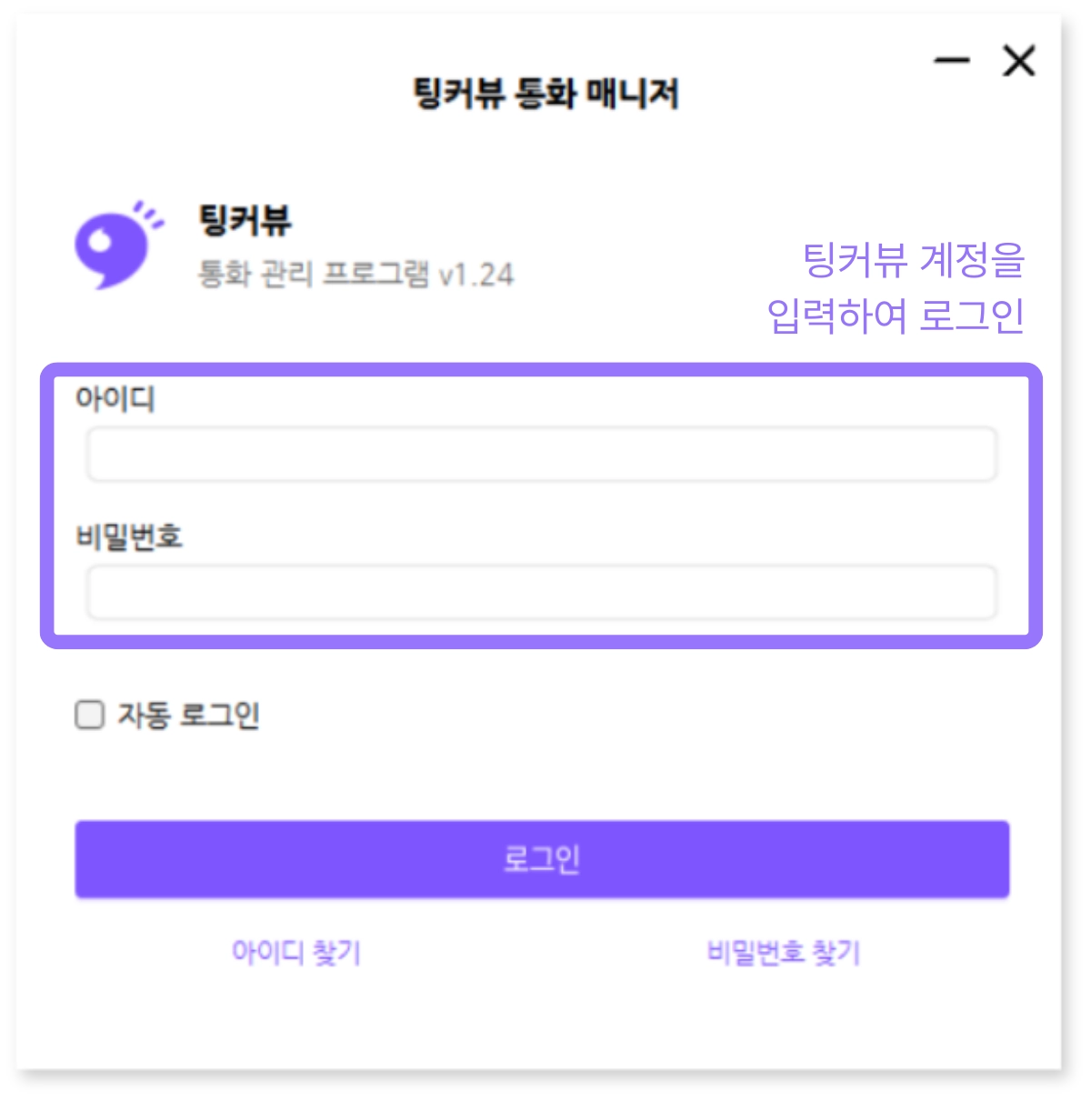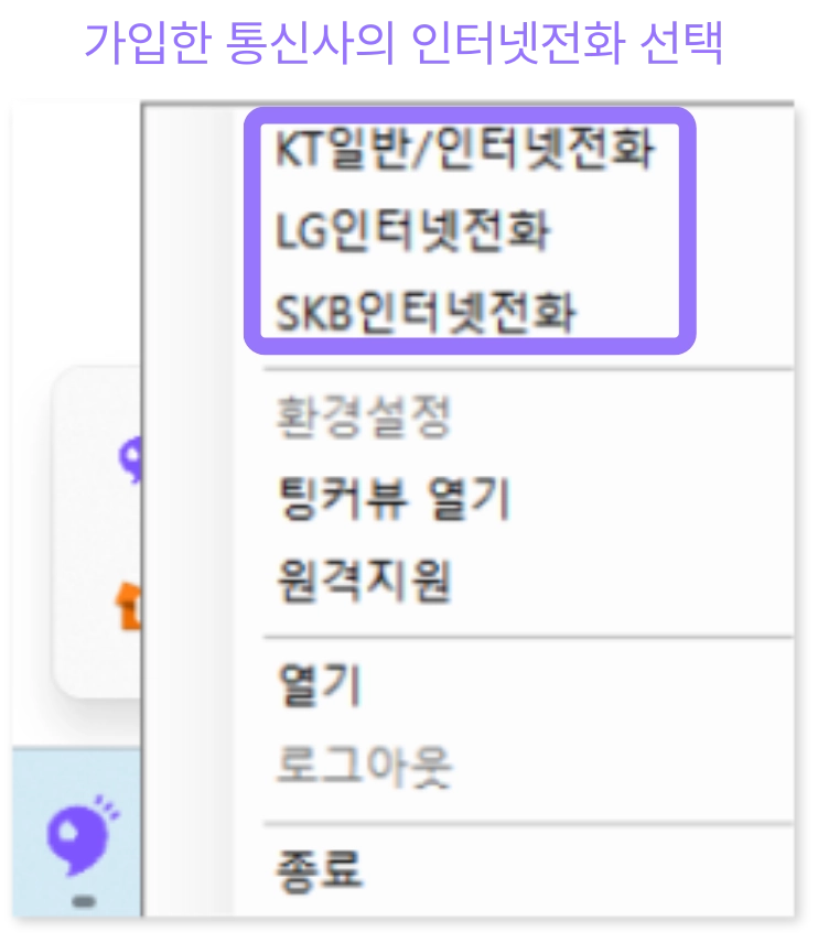 이용중인 통신사 인터넷 전화에 먼저 로그인하셔야 팅커뷰 통화매니저에 로그인이 가능합니다.