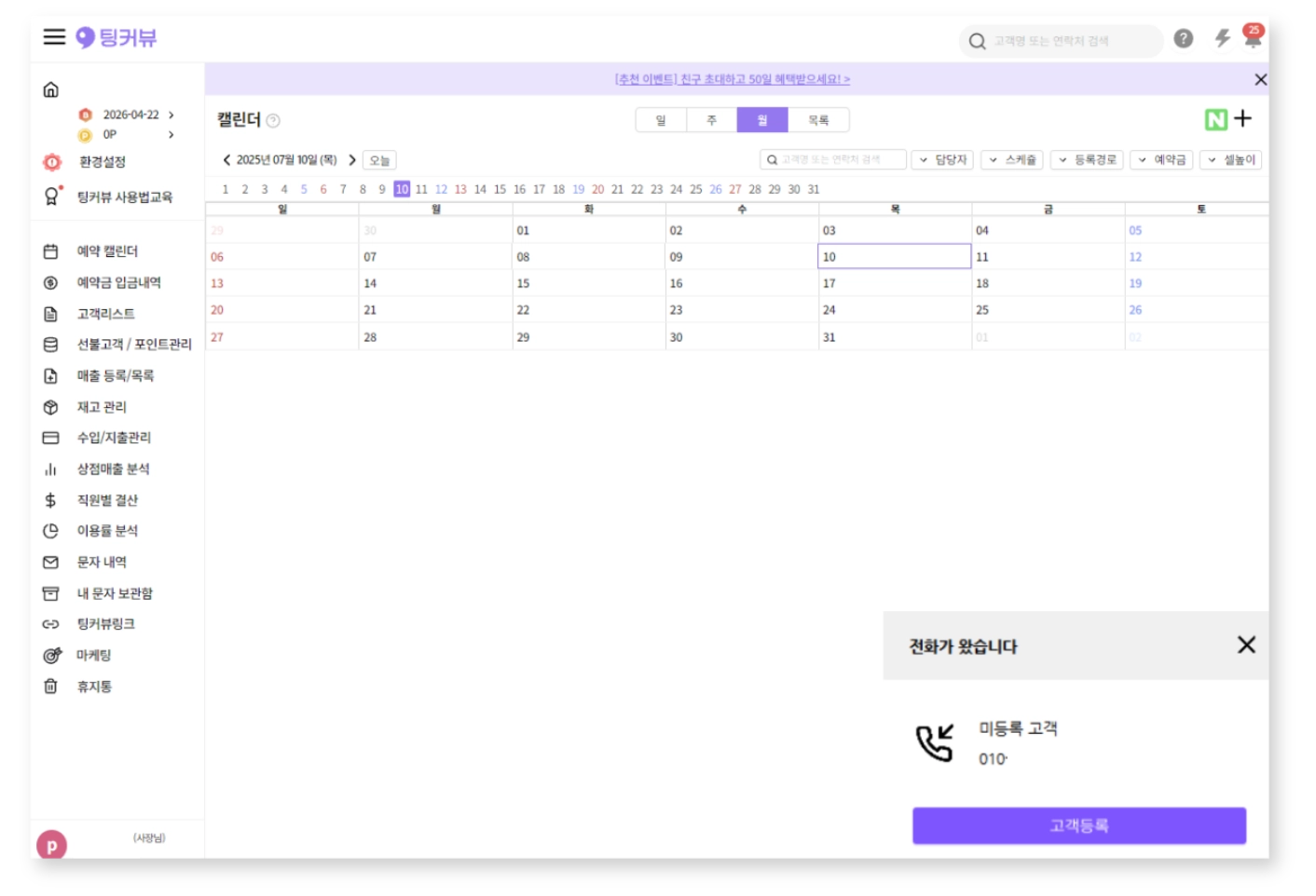 미등록 고객일 경우 ‘고객등록’을 눌러 샵 고객으로 등록할 수 있습니다.