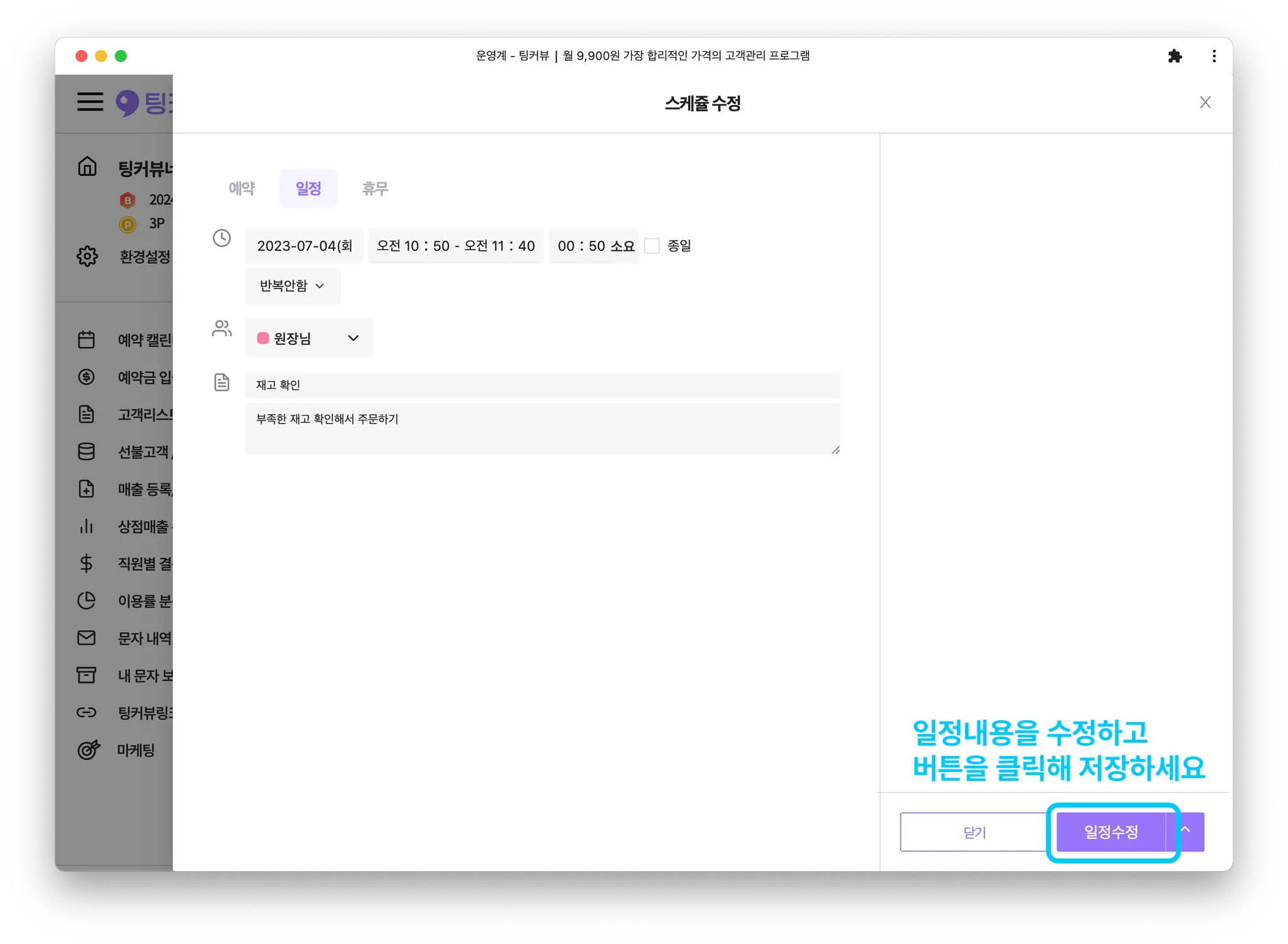 개인 약속, 메모 등은 일정으로 등록해 관리해보세요! 예약,휴무와 다른 ui로 한 눈에 구분할 수 있고 일정만 따로 모아볼 수 있어요!