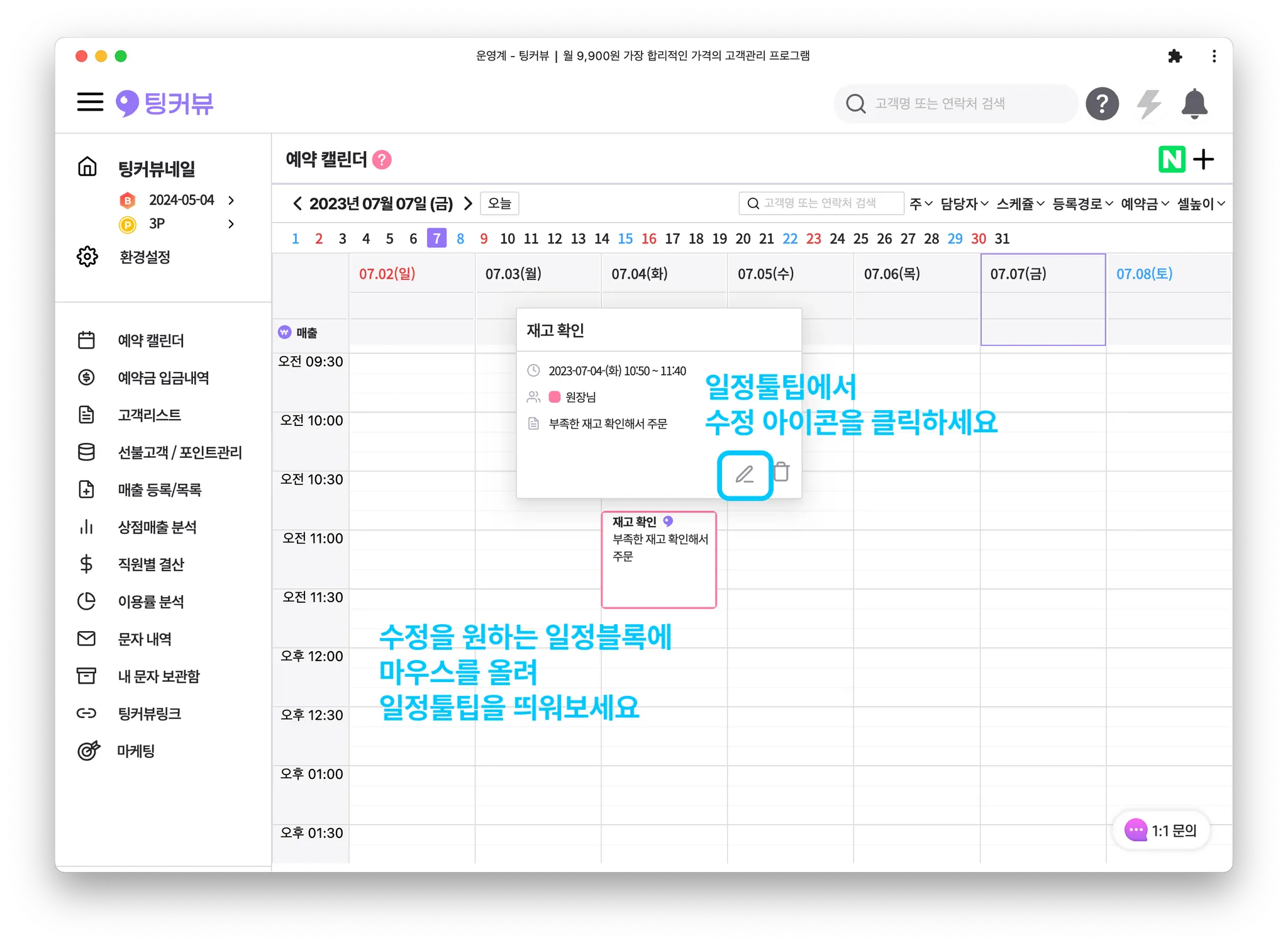 일정툴팁에서 [수정] 아이콘을 클릭하세요.