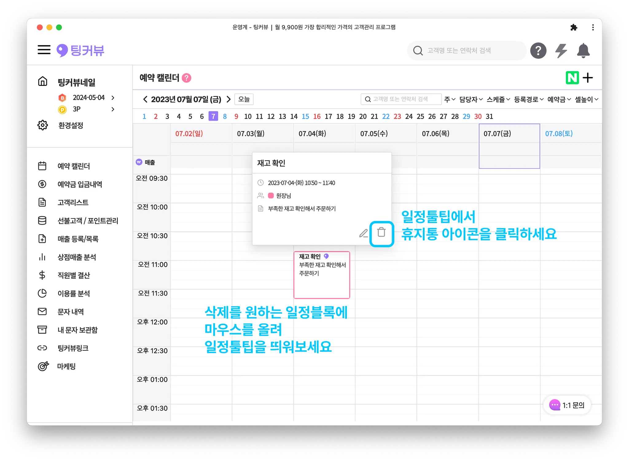 일정툴팁에서 [휴지통] 아이콘을 클릭하세요.