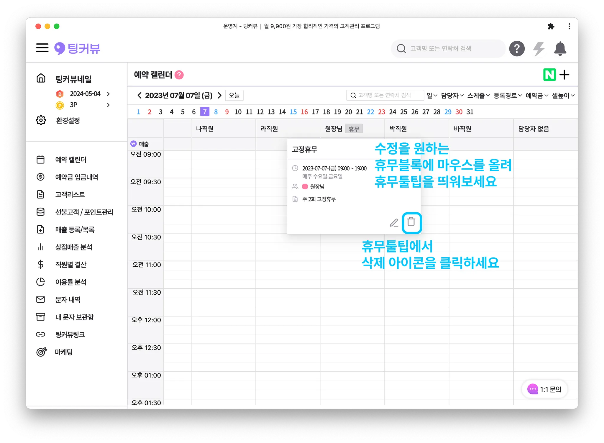 삭제를 원하는 휴무에 마우스를 올려 휴무툴팁을 띄워보세요.