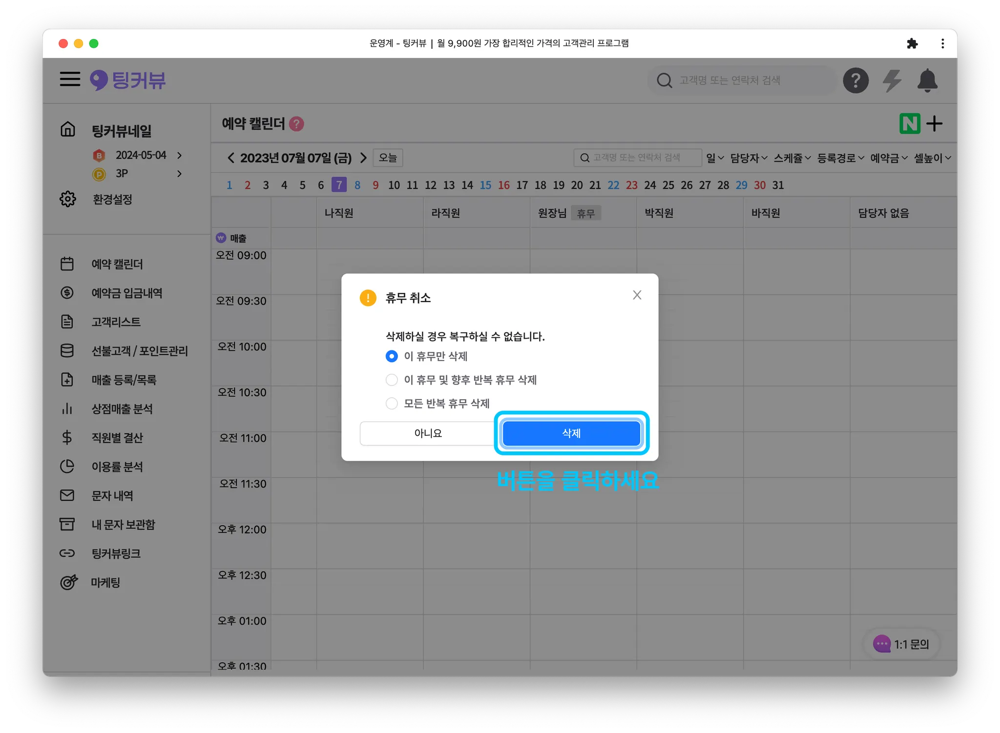 휴무툴팁에서 [휴지통] 아이콘을 클릭하세요.