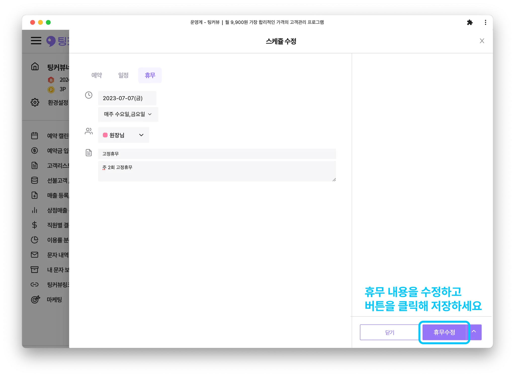 휴무 수정화면에서 내용을 수정하고 [휴무수정] 버튼을 클릭하세요.