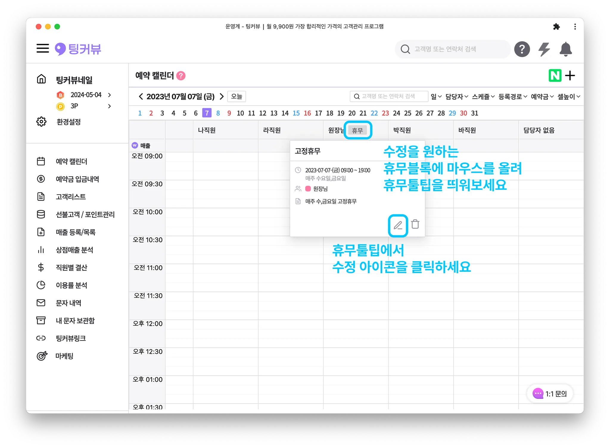휴무툴팁에서 [수정] 아이콘을 클릭하세요.