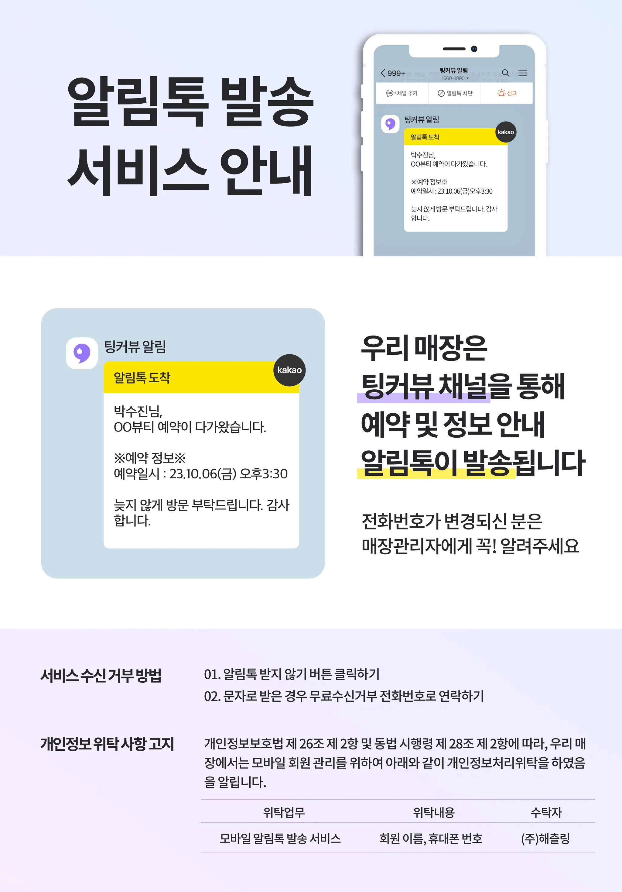 팅커뷰 채널로 알림톡을 발송하기 위해서 매장 내에 개인정보 위탁사항 고지를 해야해요. 고지하지 않을 시 개인정보호법을 위반하여 과태료가 부과될 수 있습니다.
