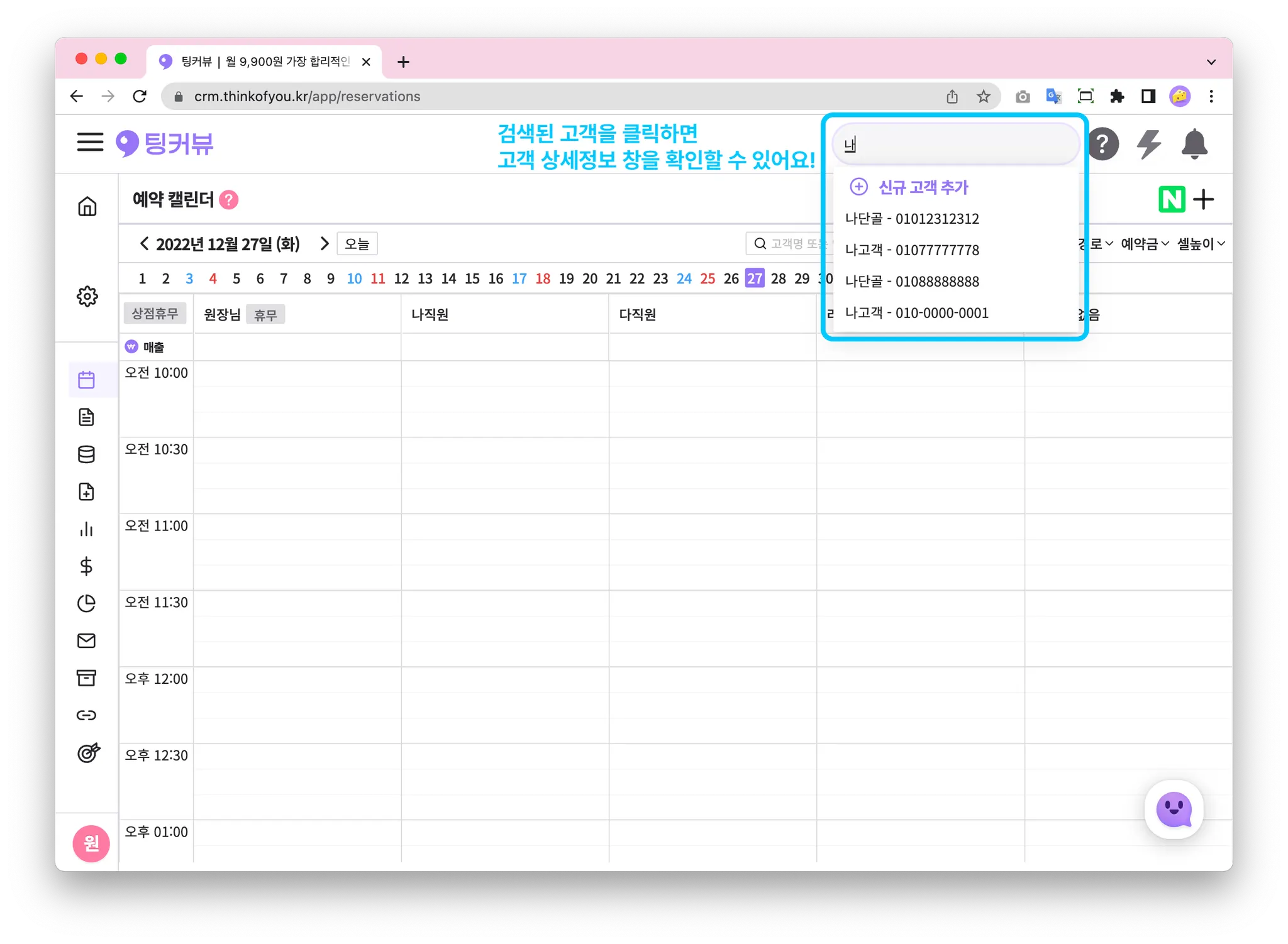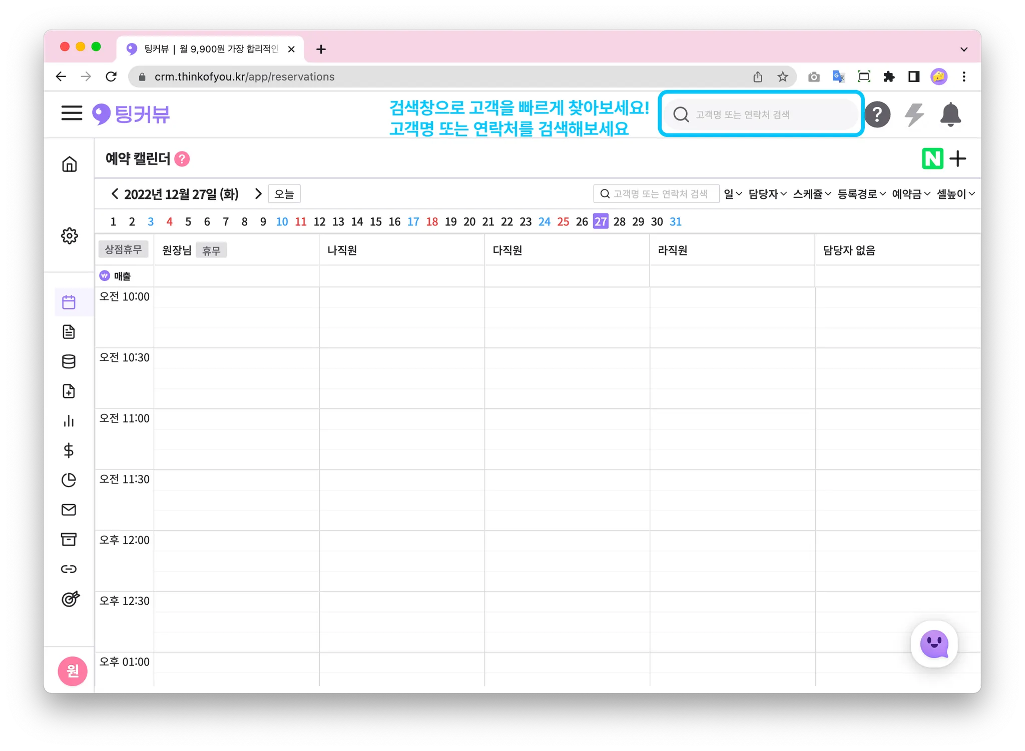 어떤 화면에서든 상단의 검색창을 이용할 수 있어요. 화면이동없이 바로 고객을 검색할 수 있으니 참 간편하죠?