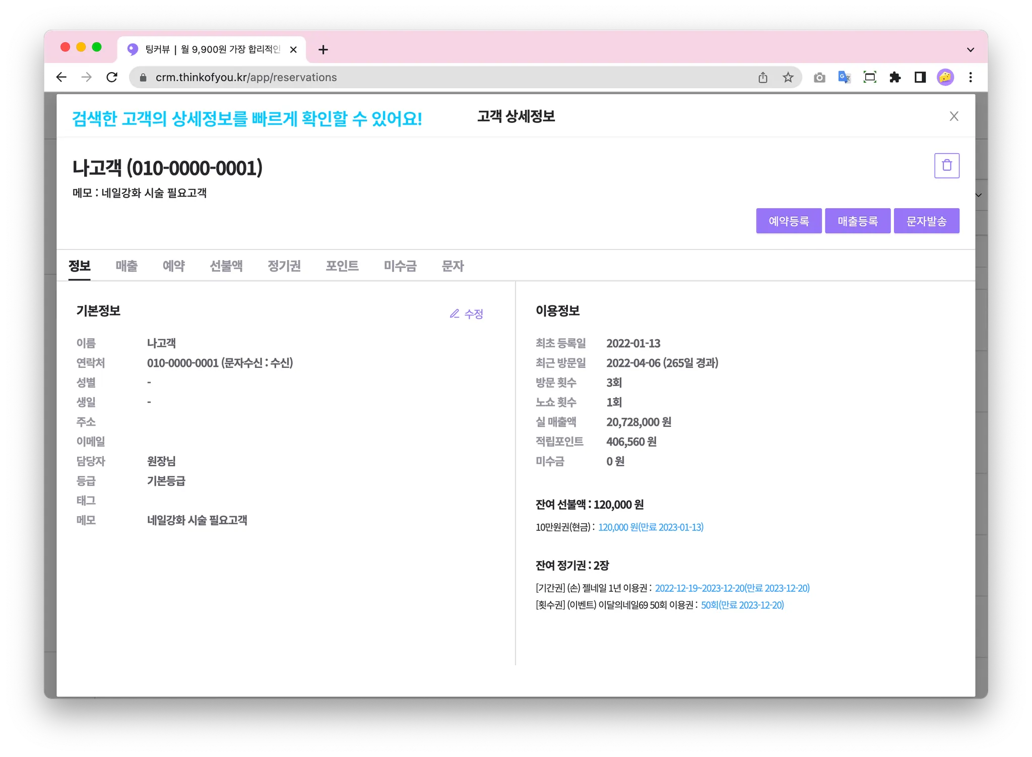 고객명 클릭 시 고객의 상세정보 확인이 가능합니다. 빠르게 예약, 매출을 등록하거나 문자를 발송할 수 있어요.