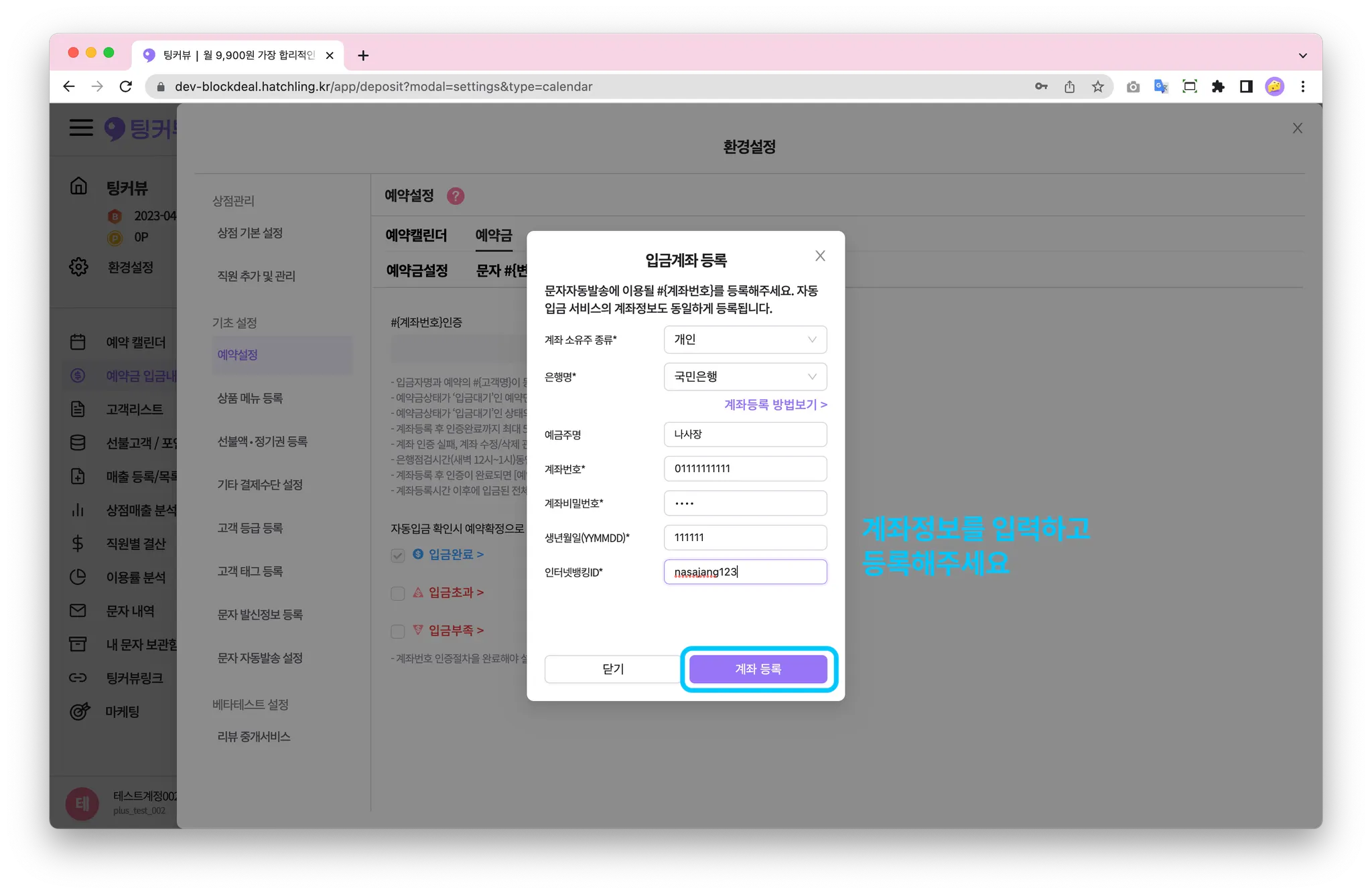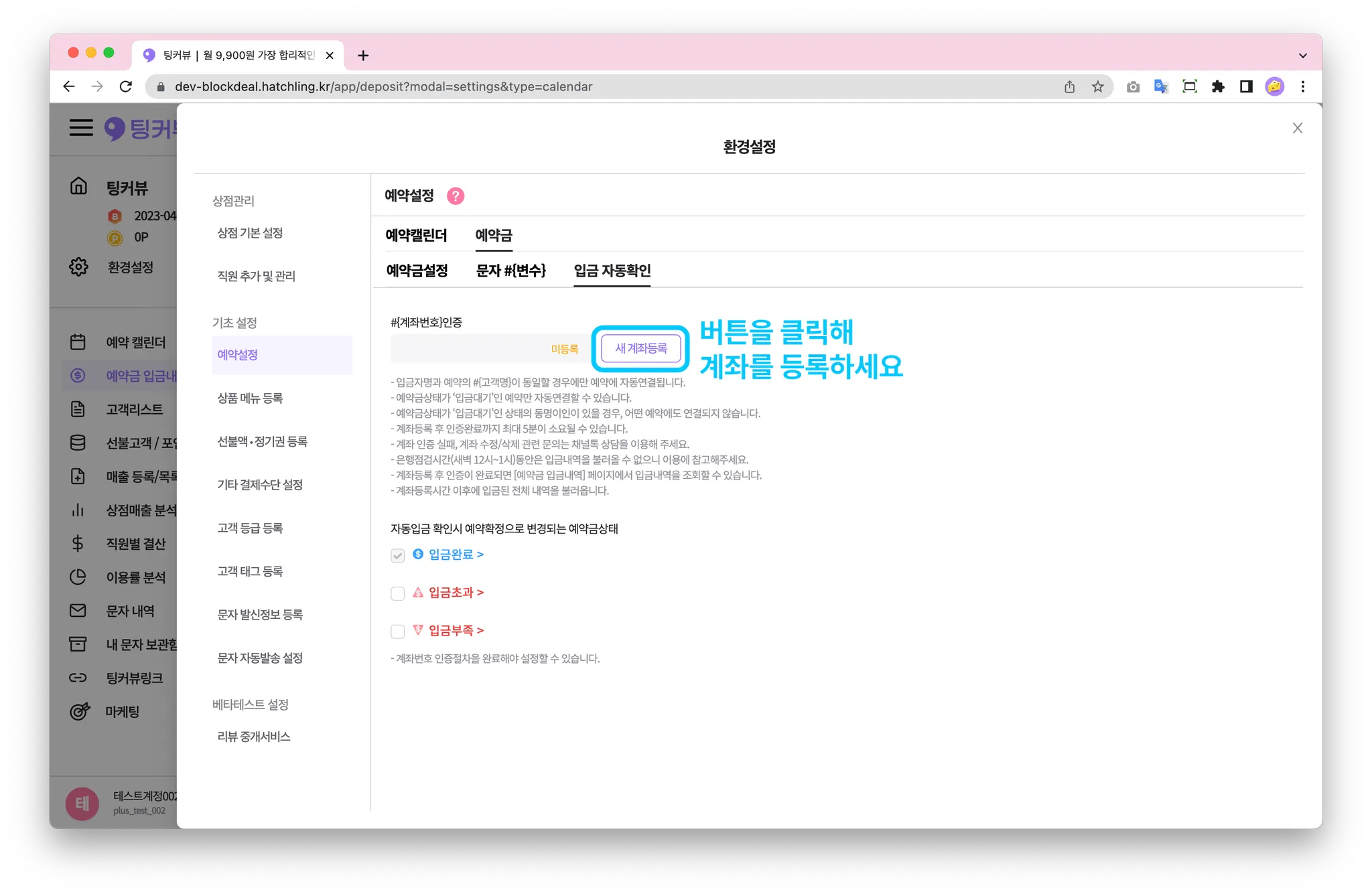 예약금입금 자동확인 서비스 이용에 꼭 필요한 설정을 해볼까요? 우선, 예약금을 입금받는 계좌연동이 필요해요!
