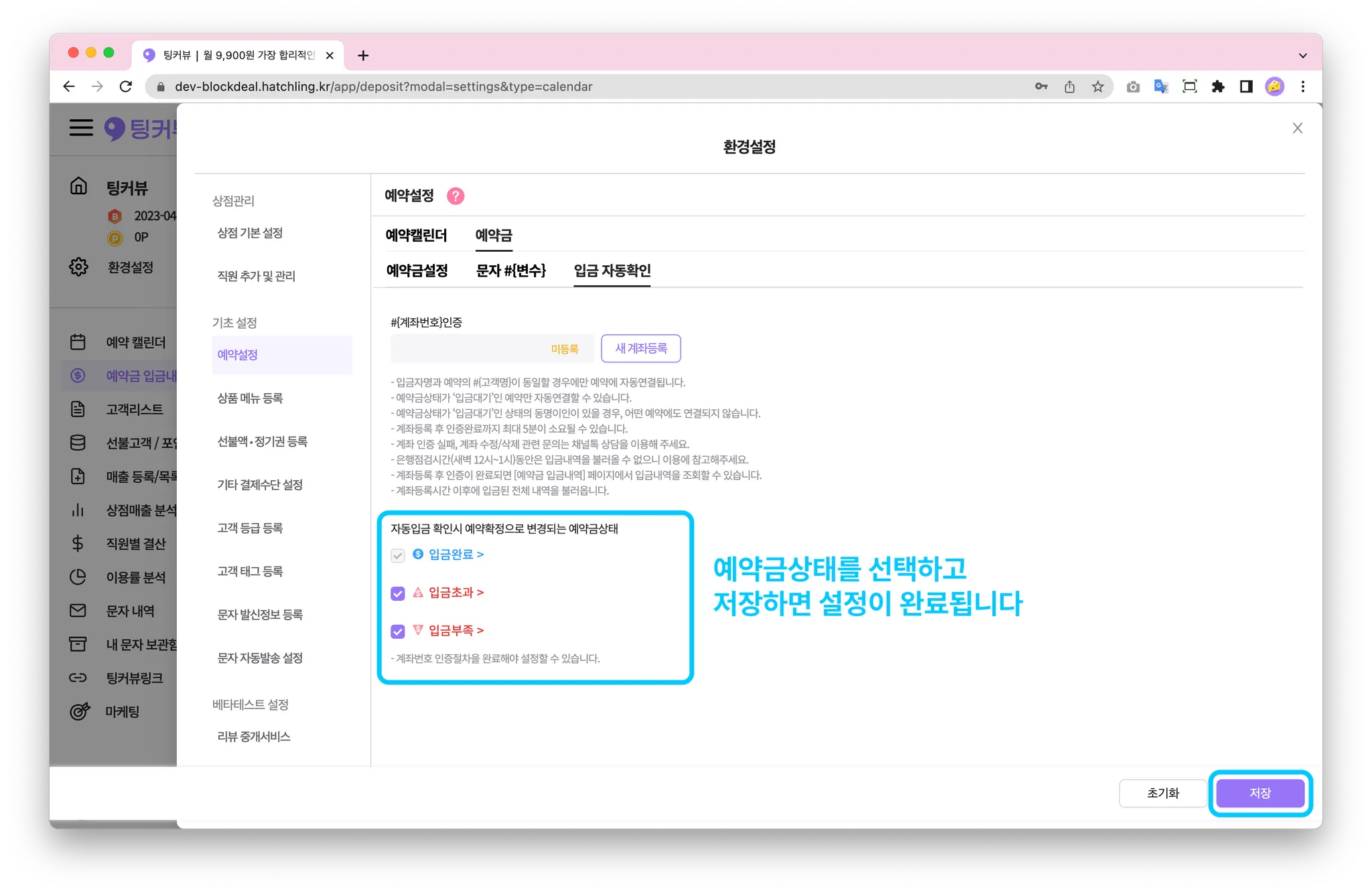 원하는 예약금상태를 선택하고 우측 하단의 [저장]버튼을 클릭하면 설정완료!