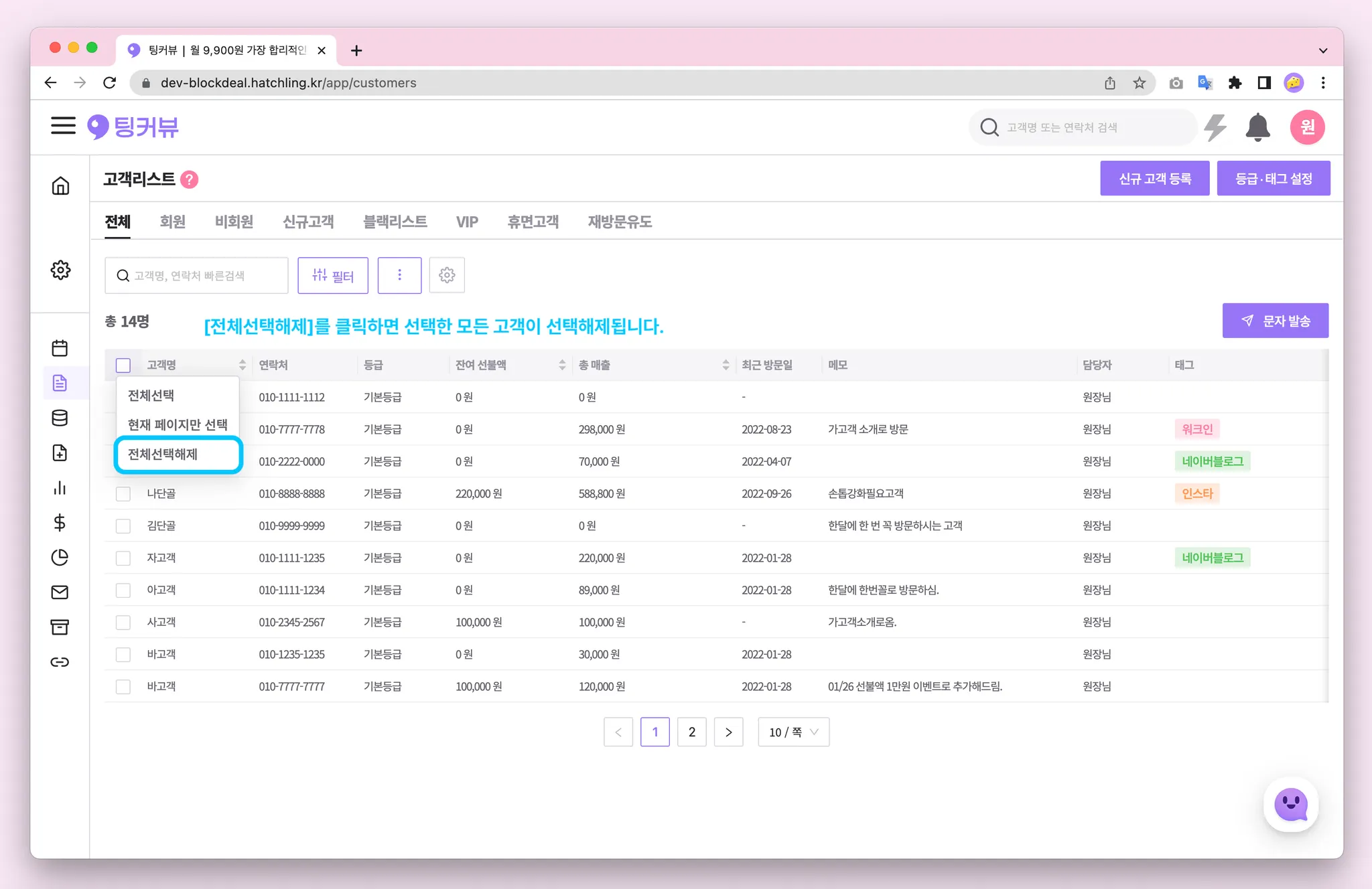 [전체선택 해제]를 누르면 선택한 모든고객이 선택해제 됩니다!