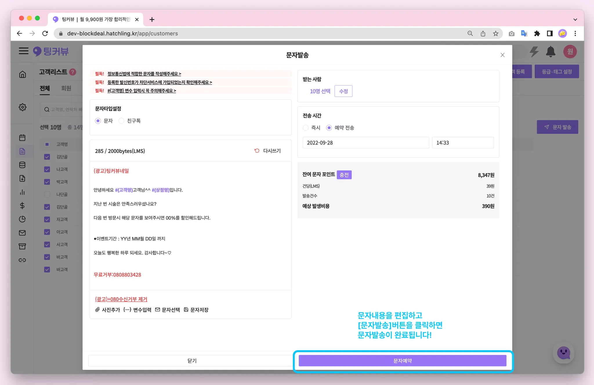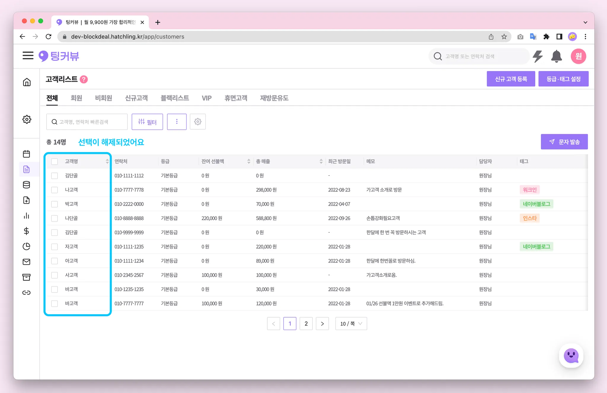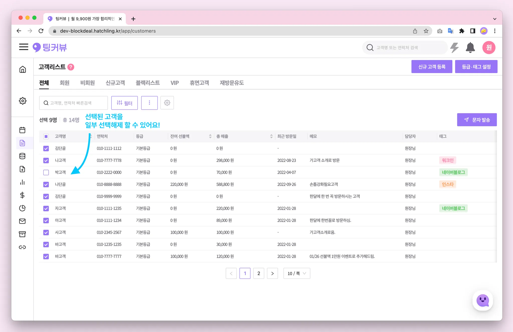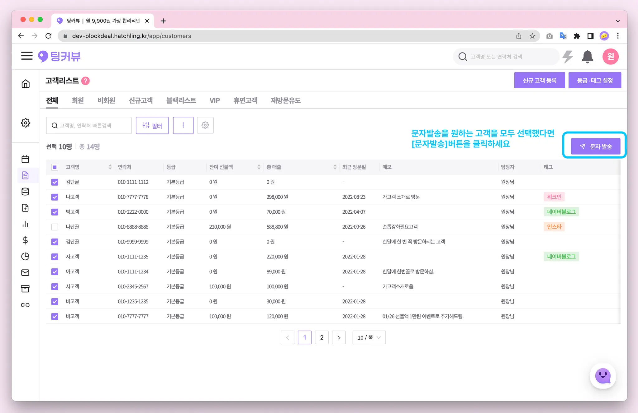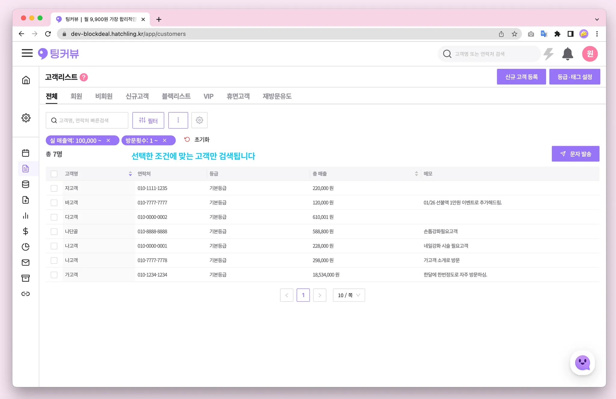 원하는 고객의 정보를 빠르게 찾거나 선택한 고객에게 문자를 발송해보세요!