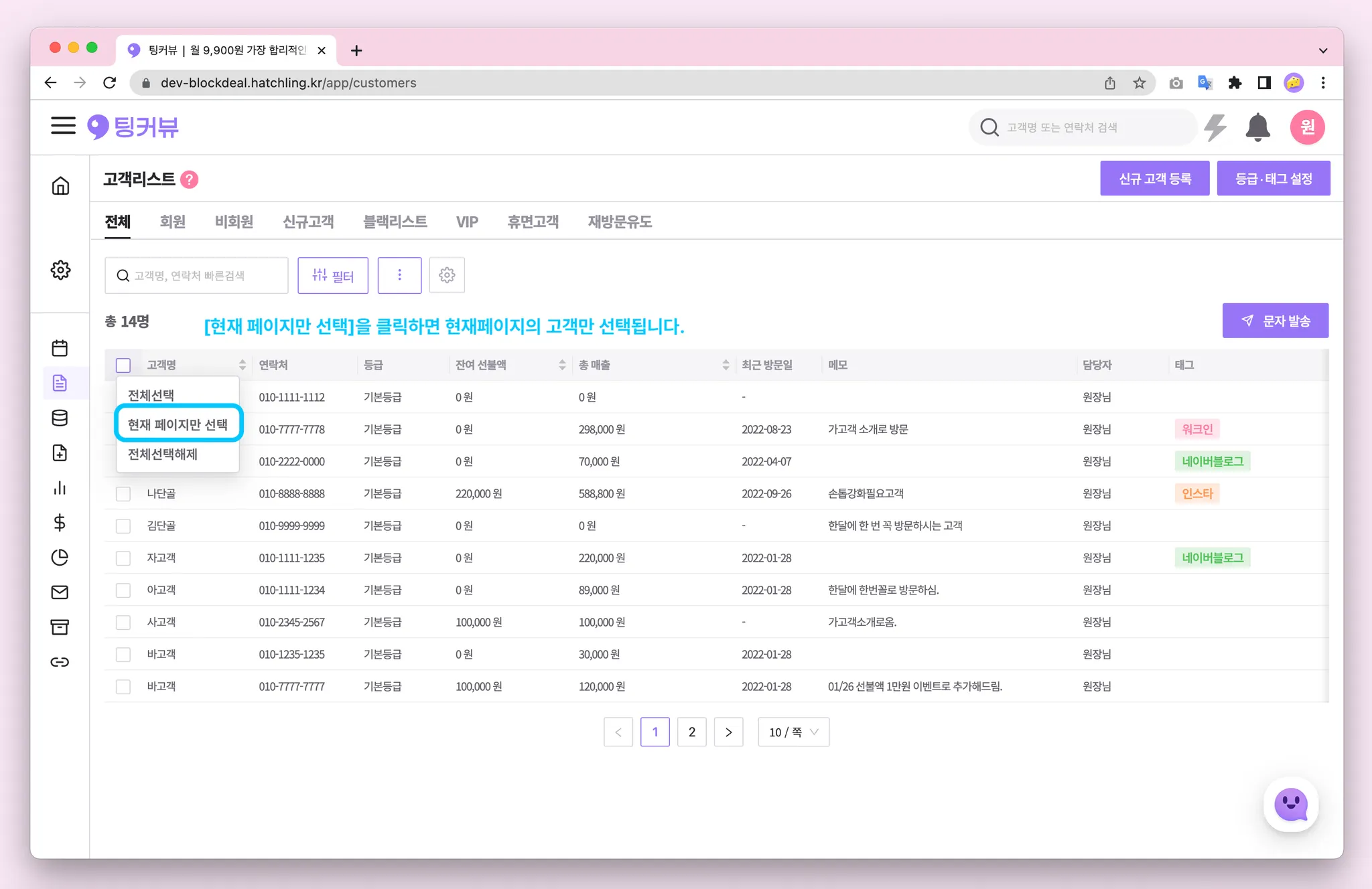 [현재 페이지만 선택]을 누르면 현재 보고있는 페이지의 고객만 선택됩니다.