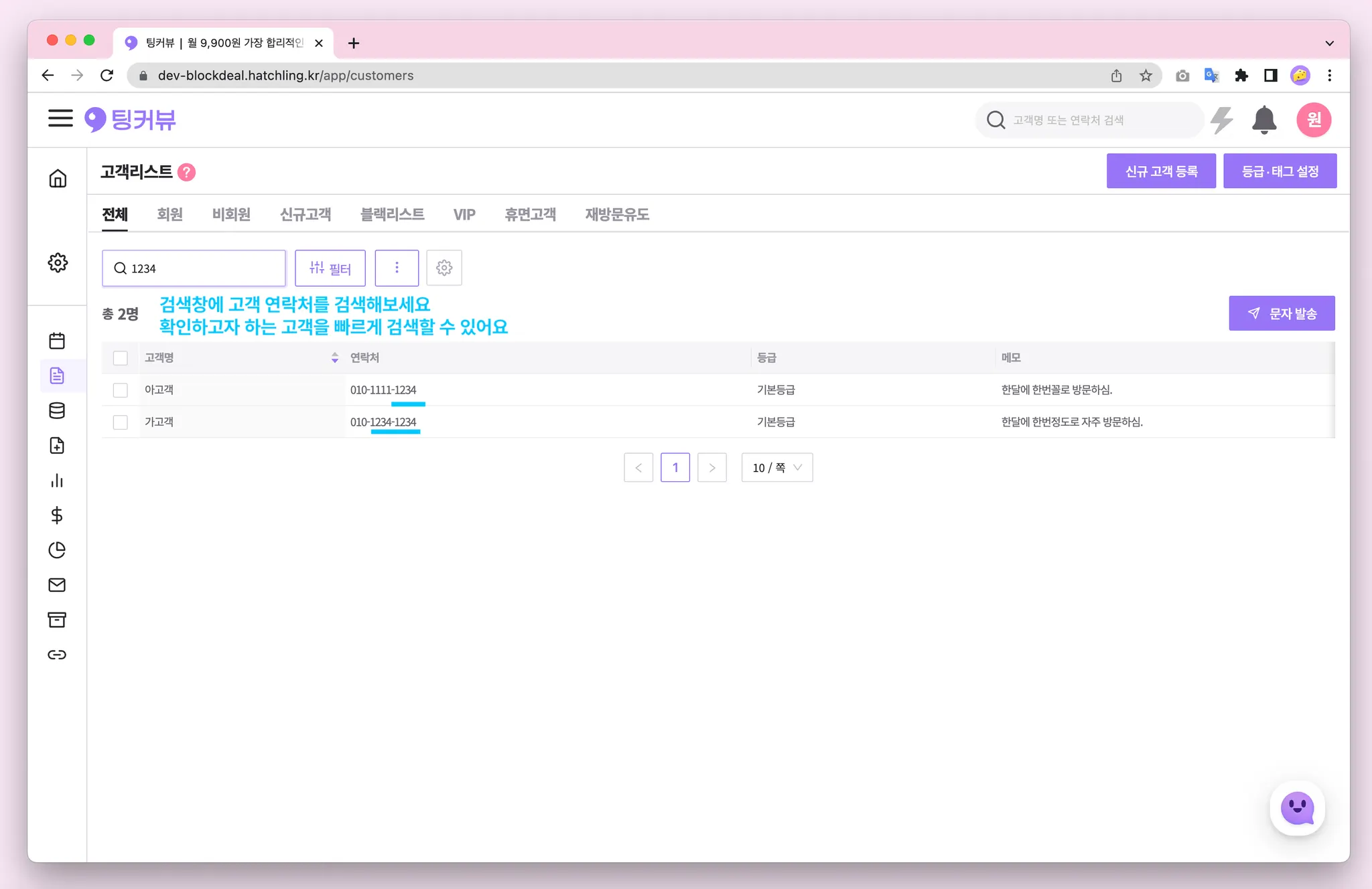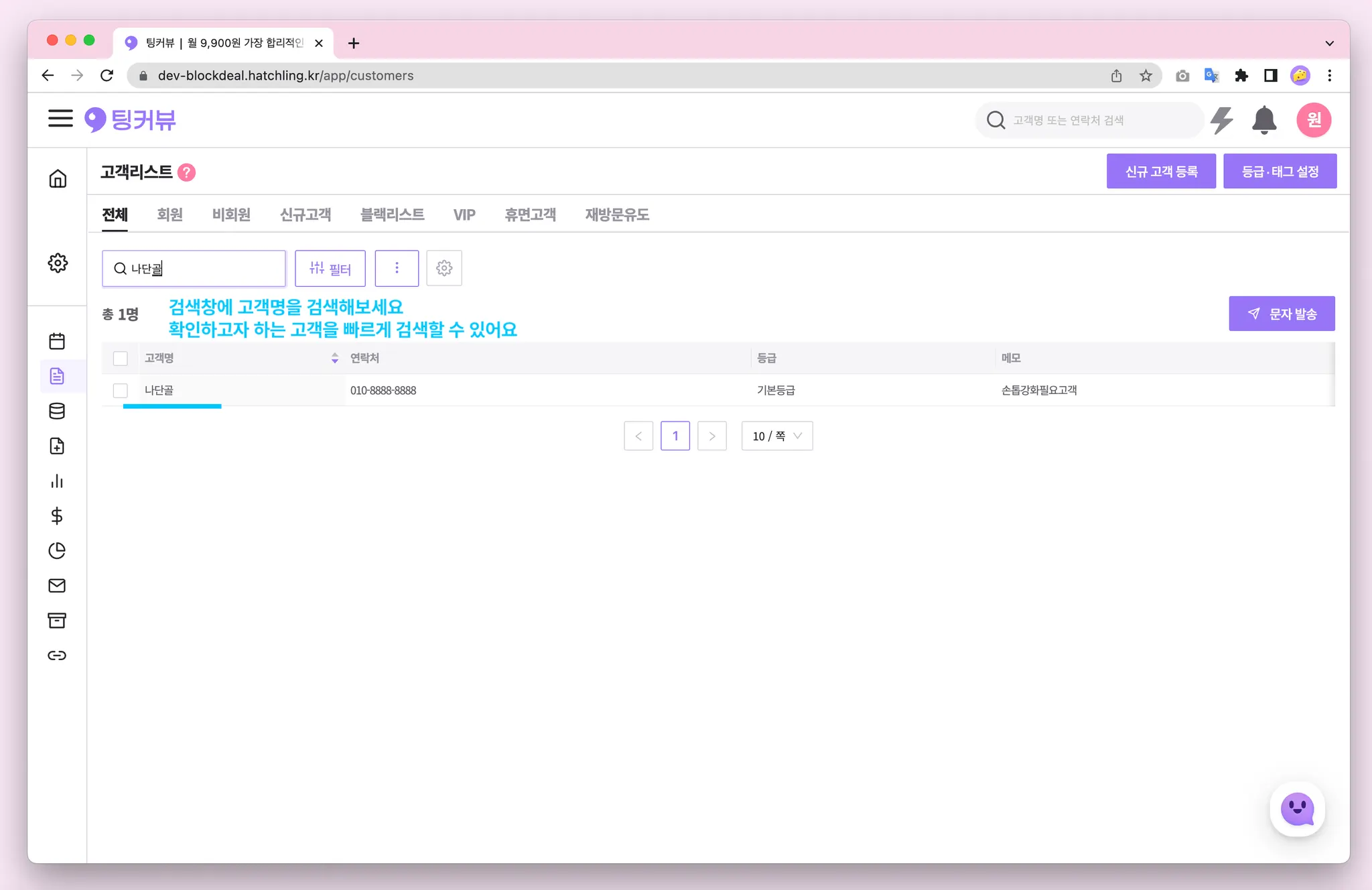 검색창에 고객명 또는 연락처를 검색해보세요! 확인하고자 하는 고객을 빠르게 검색할 수 있어요