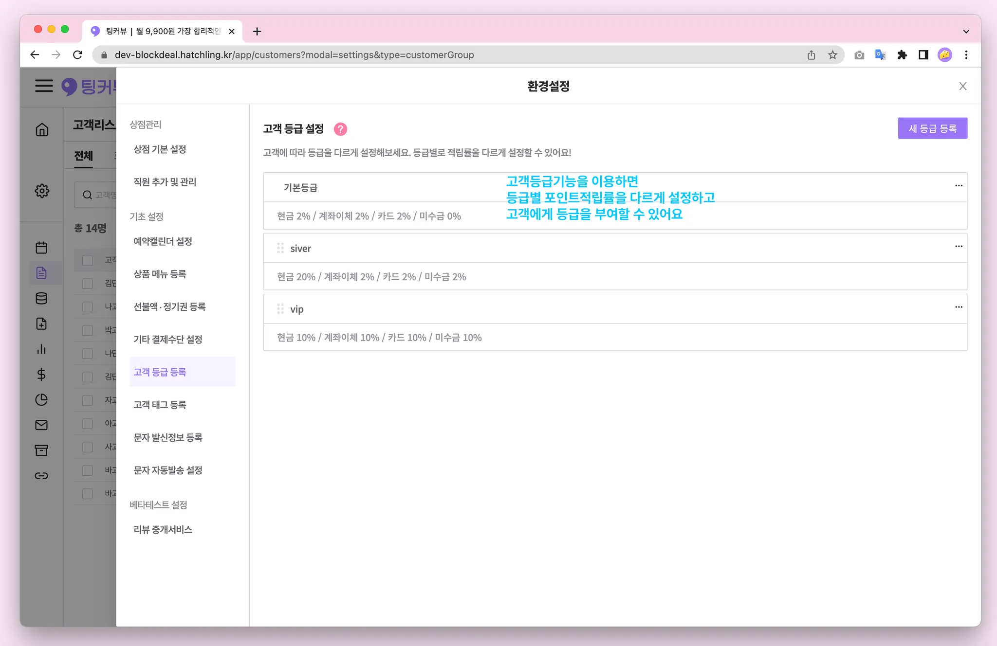등급∙태그 설정 기능을 이용하면 고객에게 등급을 부여하고 포인트적립률을 다르게 설정하거나, 고객특이정보에 대한 태그라벨을 설정할 수 있어요!