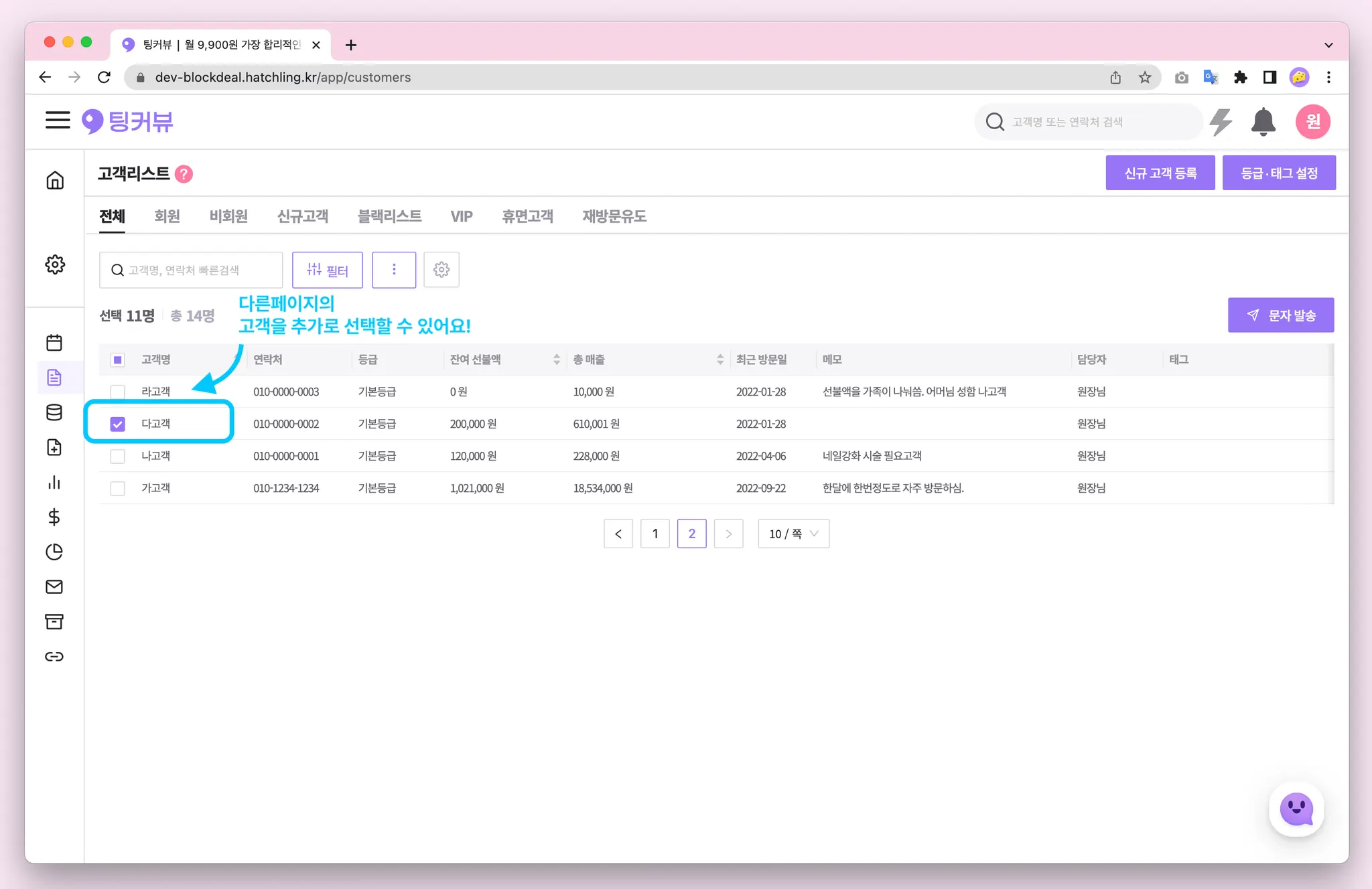 현재페이지의 고객을 선택한 후 다른페이지의 고객을 추가로 선택할 수 있어요!