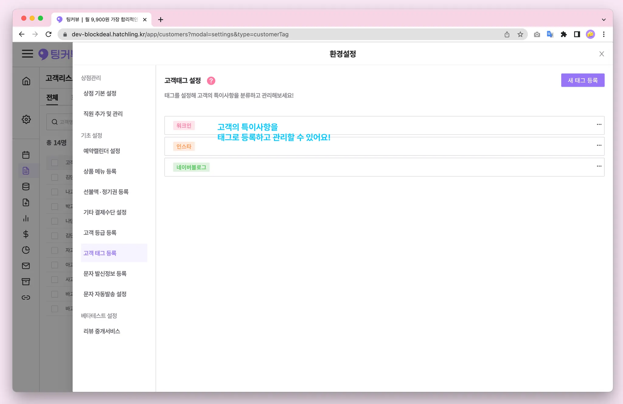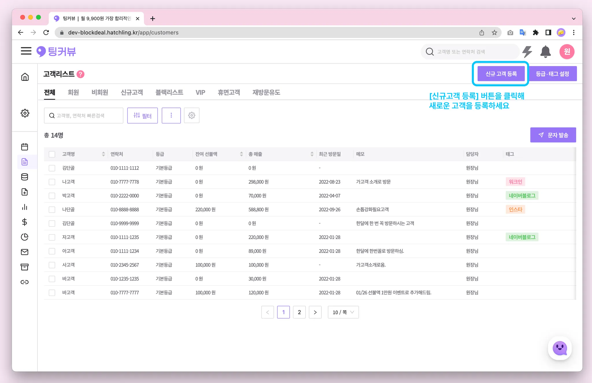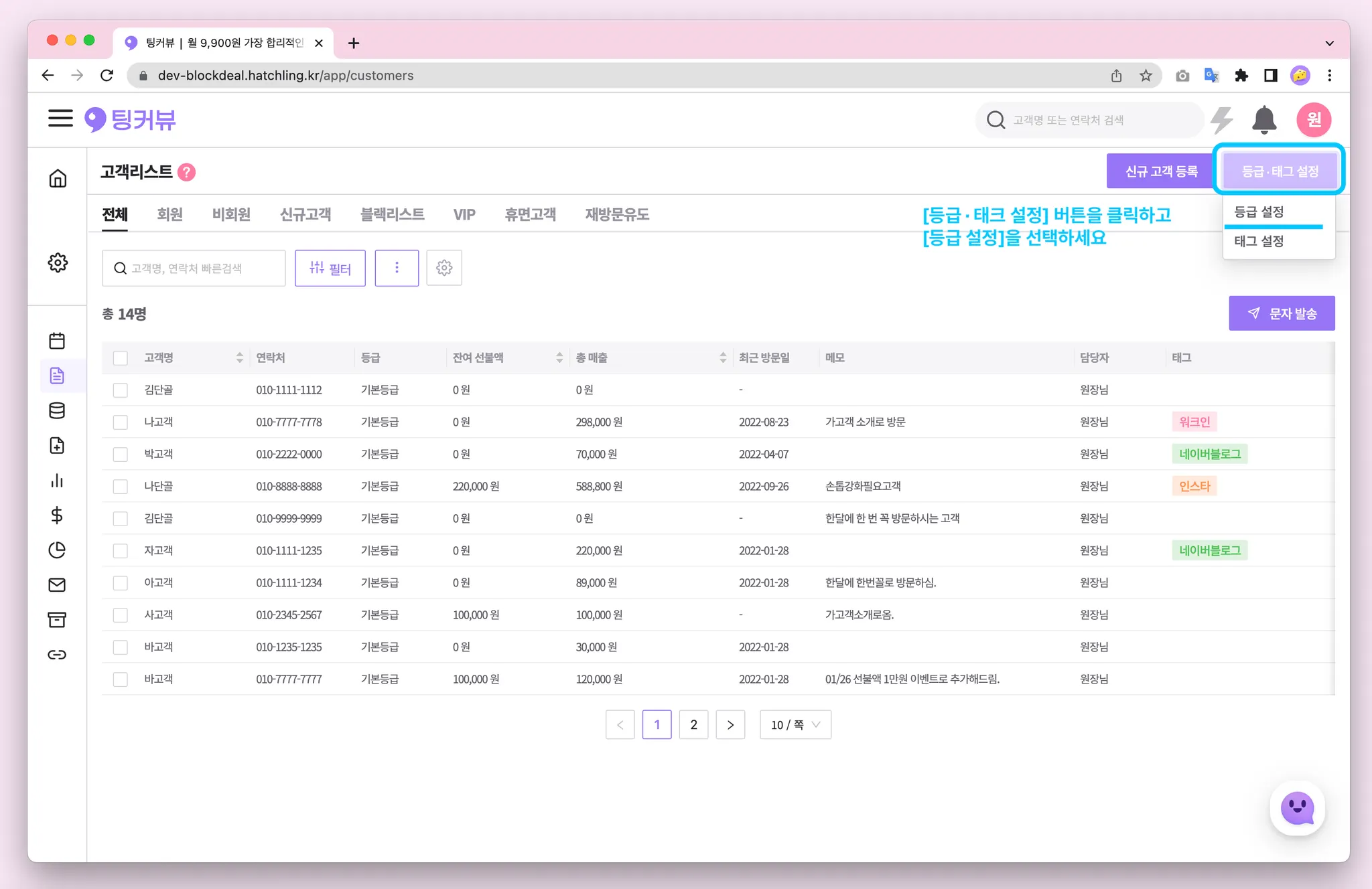 고객등급∙태그 설정이 필요하다면 고객리스트 페이지 우측상단의 [등급∙태그설정] 버튼을 클릭해보세요!