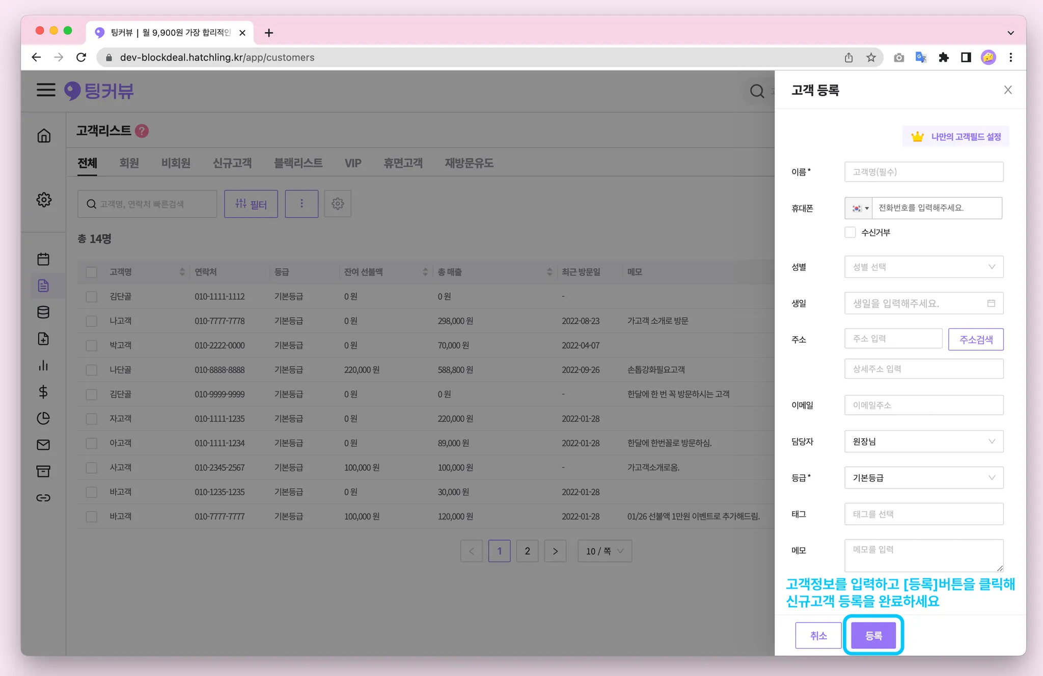 고객리스트 페이지 우측상단의 [신규고객등록] 버튼을 클릭하면 신규 고객을 등록할 수 있어요!
