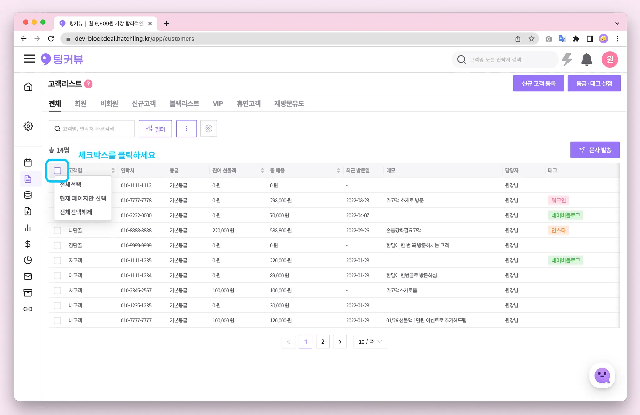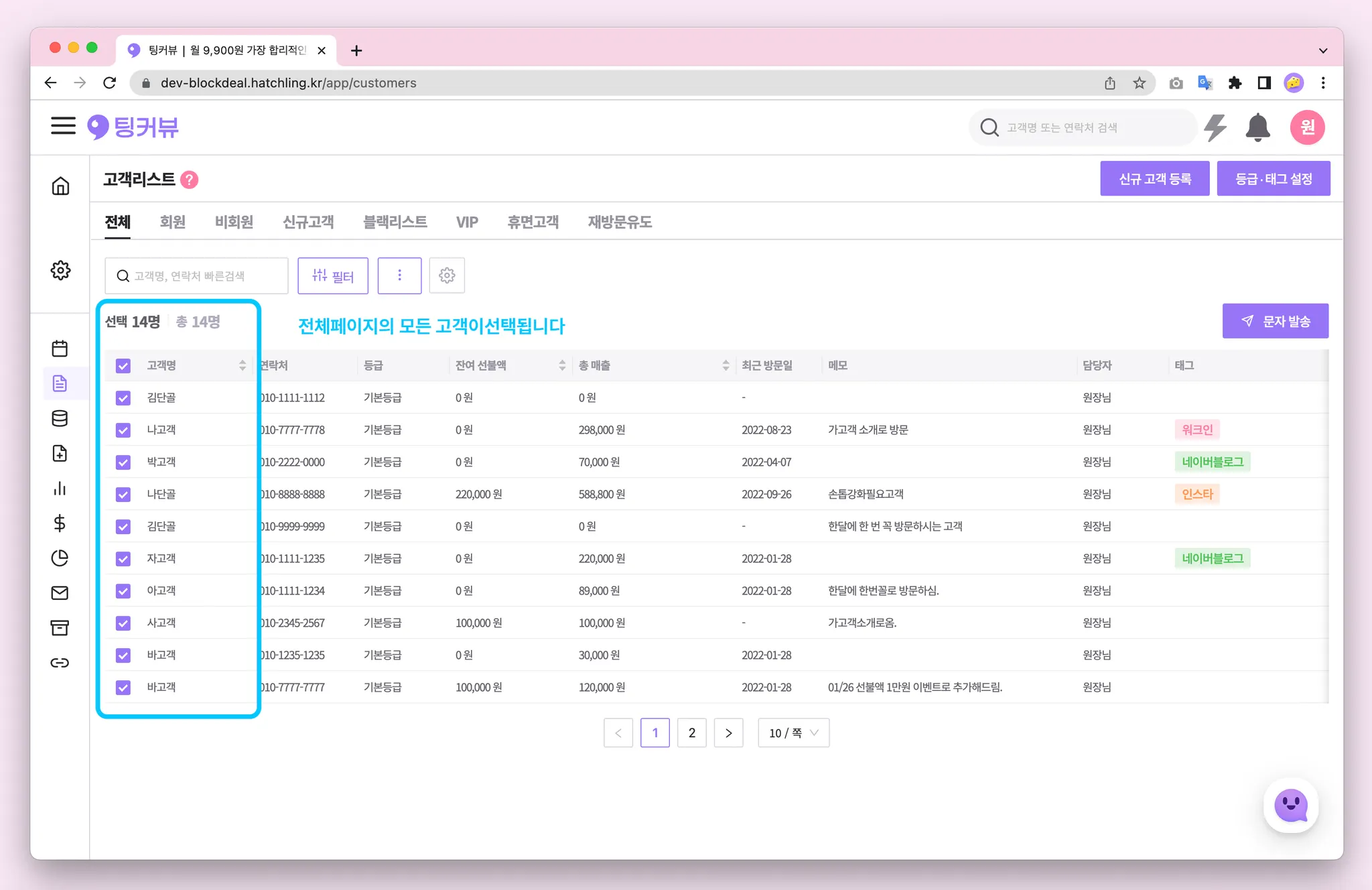 [전체선택]을 누르면 전체페이지의 모든 고객이 선택됩니다.