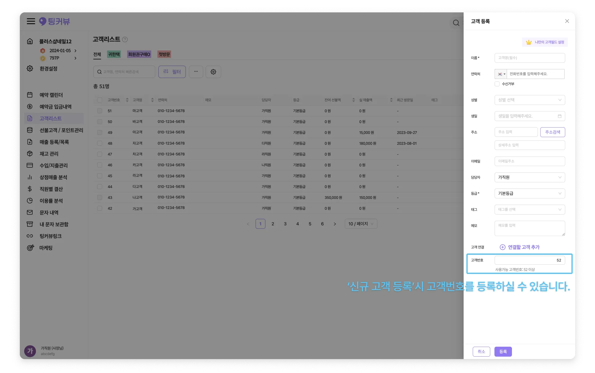 고객번호를 사용해 고객을 구분하시나요? 고객등록에서 고객번호를 입력해보세요. 한번만 등록을 완료해주시면 이후에는 자동으로 번호를 기입해 드립니다.