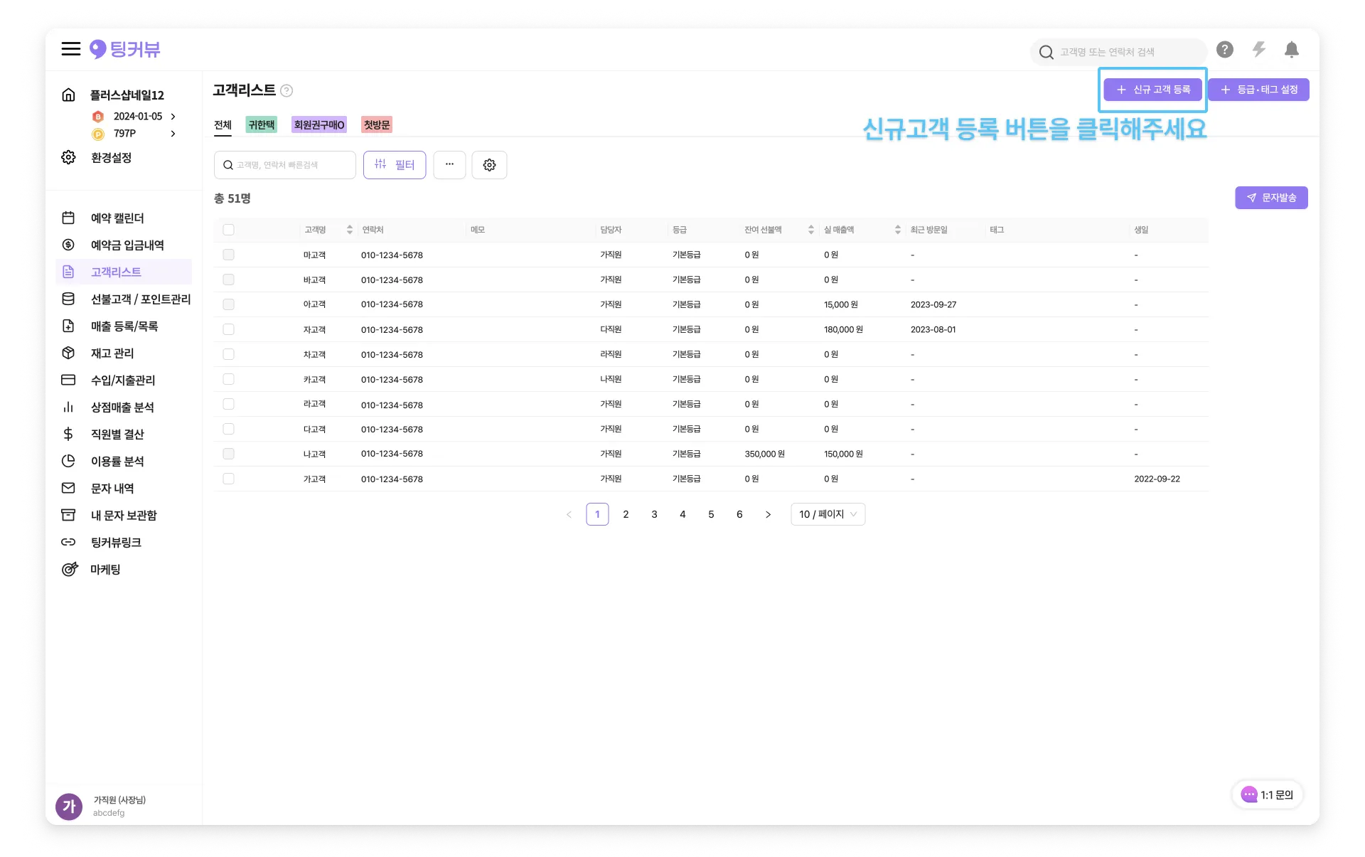 고객리스트 페이지에서 신규고객등록 을 클릭해주세요.