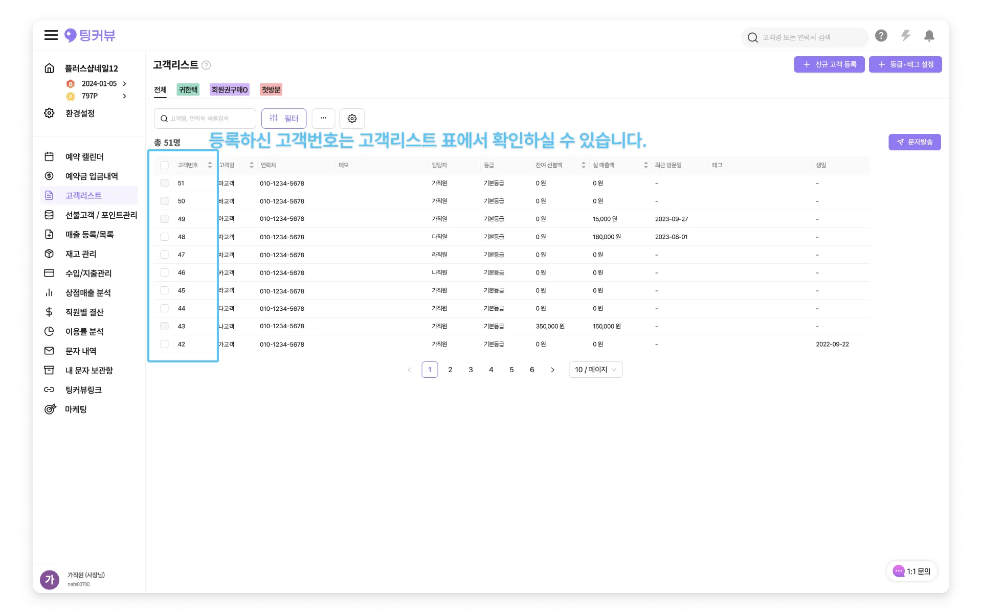 고객리스트 표에서도 고객번호를 확인하실 수 있습니다.