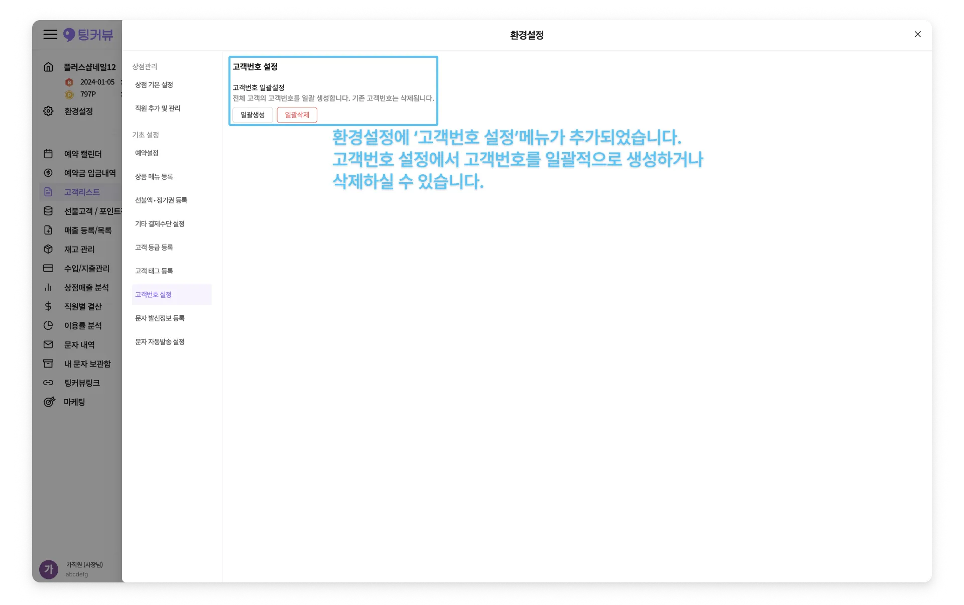 이전의 고객들도 전부 고객번호를 생성하고 싶으시다면 환경설정 → 고객번호등록 에서 ‘일괄생성’, ‘일괄삭제’ 가 가능합니다.