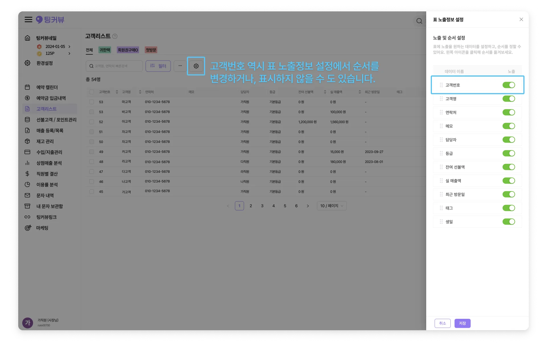 고객번호 또한 표 노출정보설정 에서 노출여부나, 순서를 선택하실 수 있습니다.
