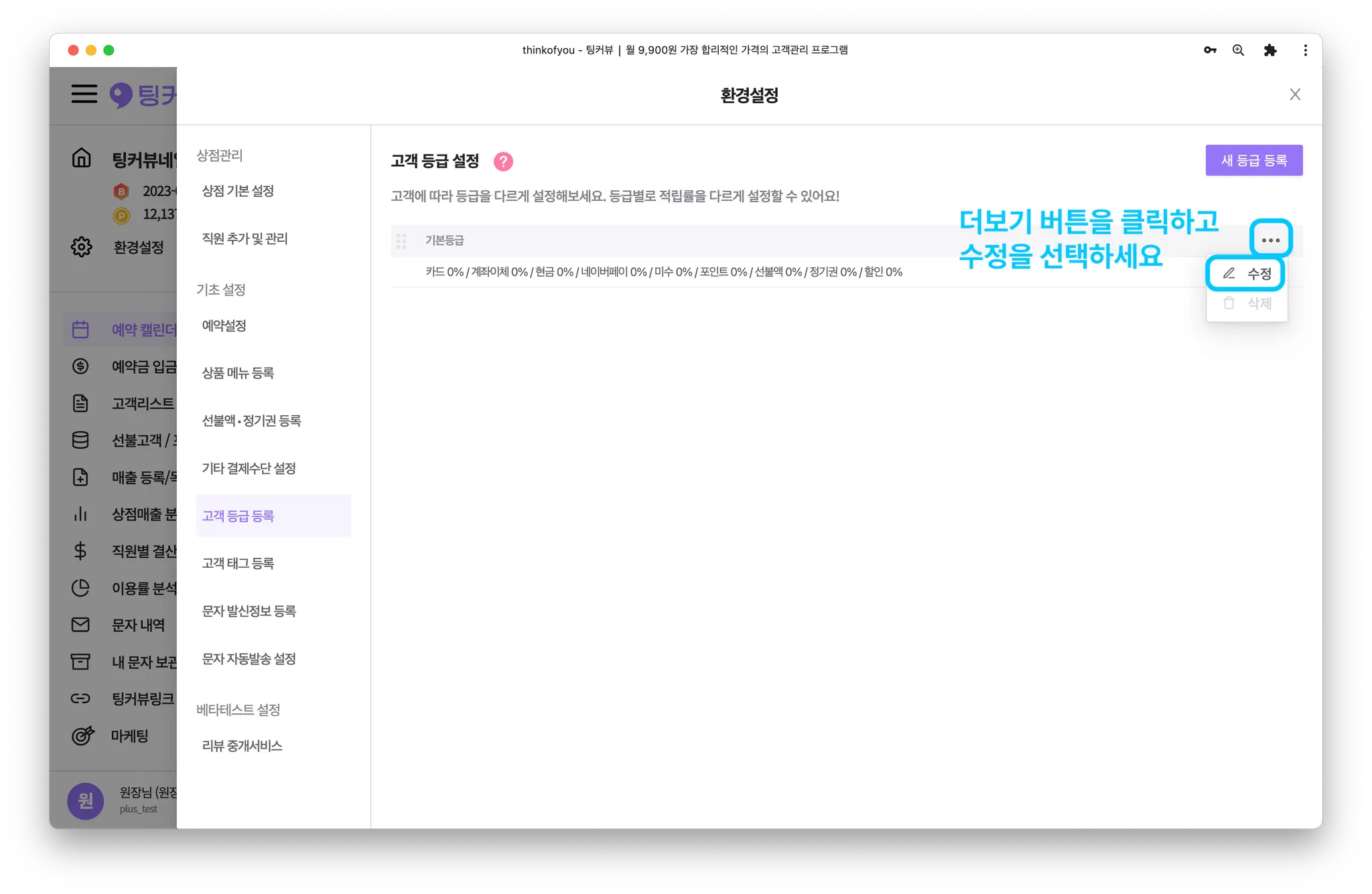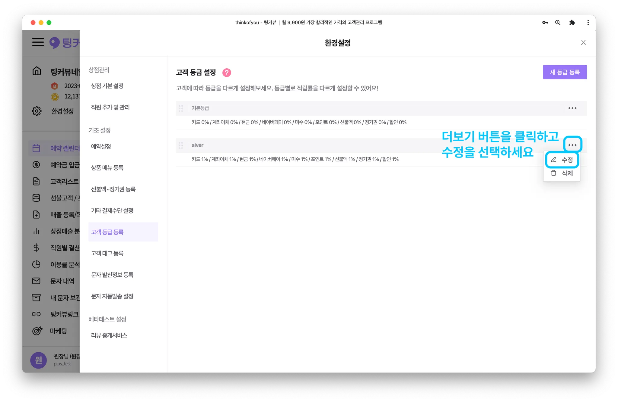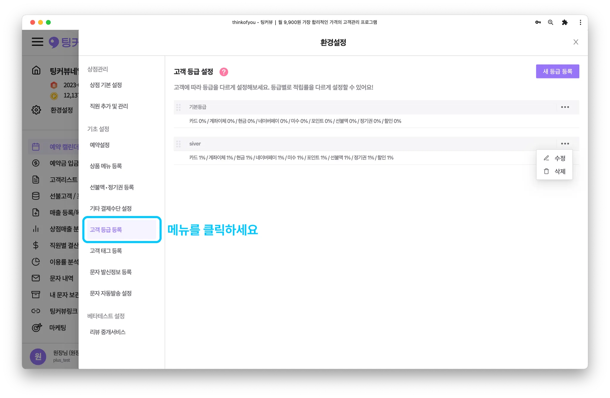 고객등급을 수정해볼까요? 환경설정 창에서 [고객 등급 등록] 메뉴를 클릭해주세요.