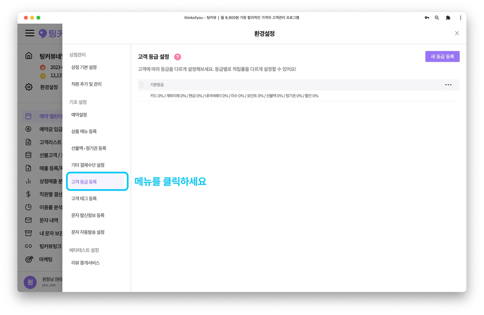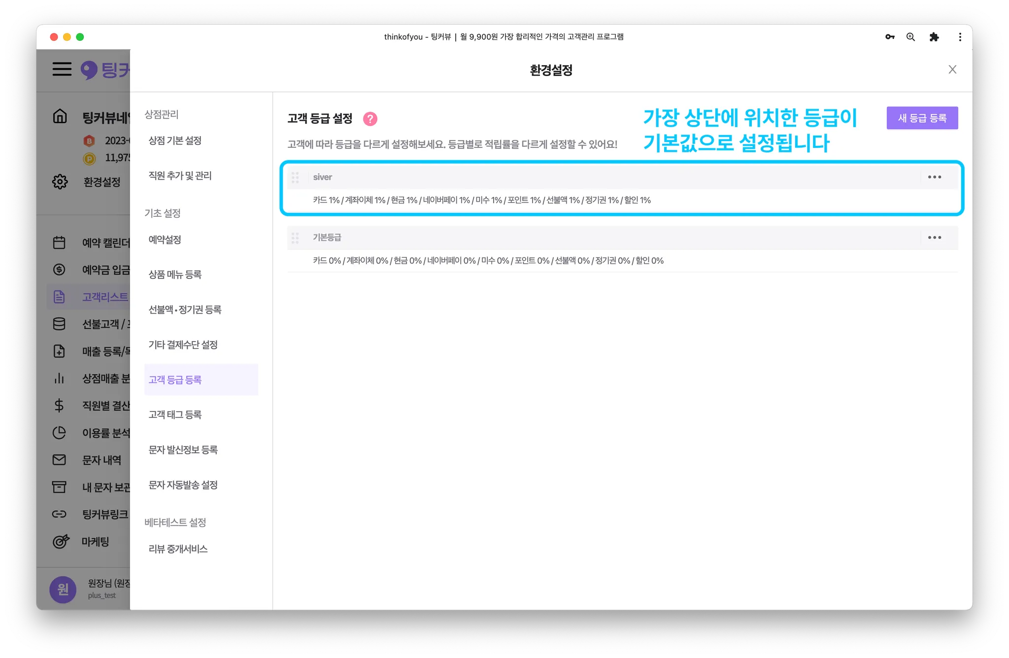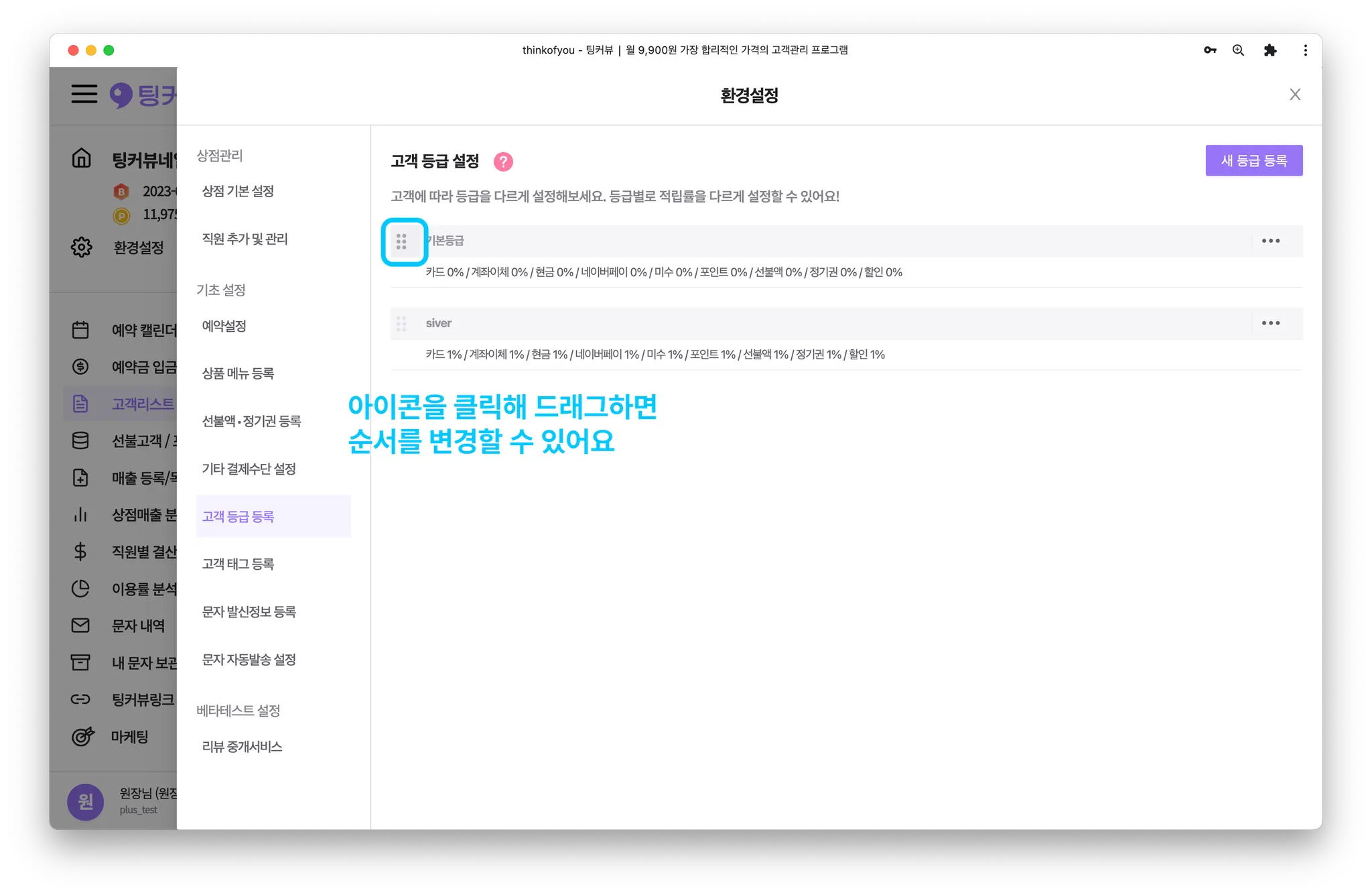 고객등급을 순서를 변경해볼까요? 환경설정 창에서 [고객 등급 등록]메뉴를 클릭해주세요.