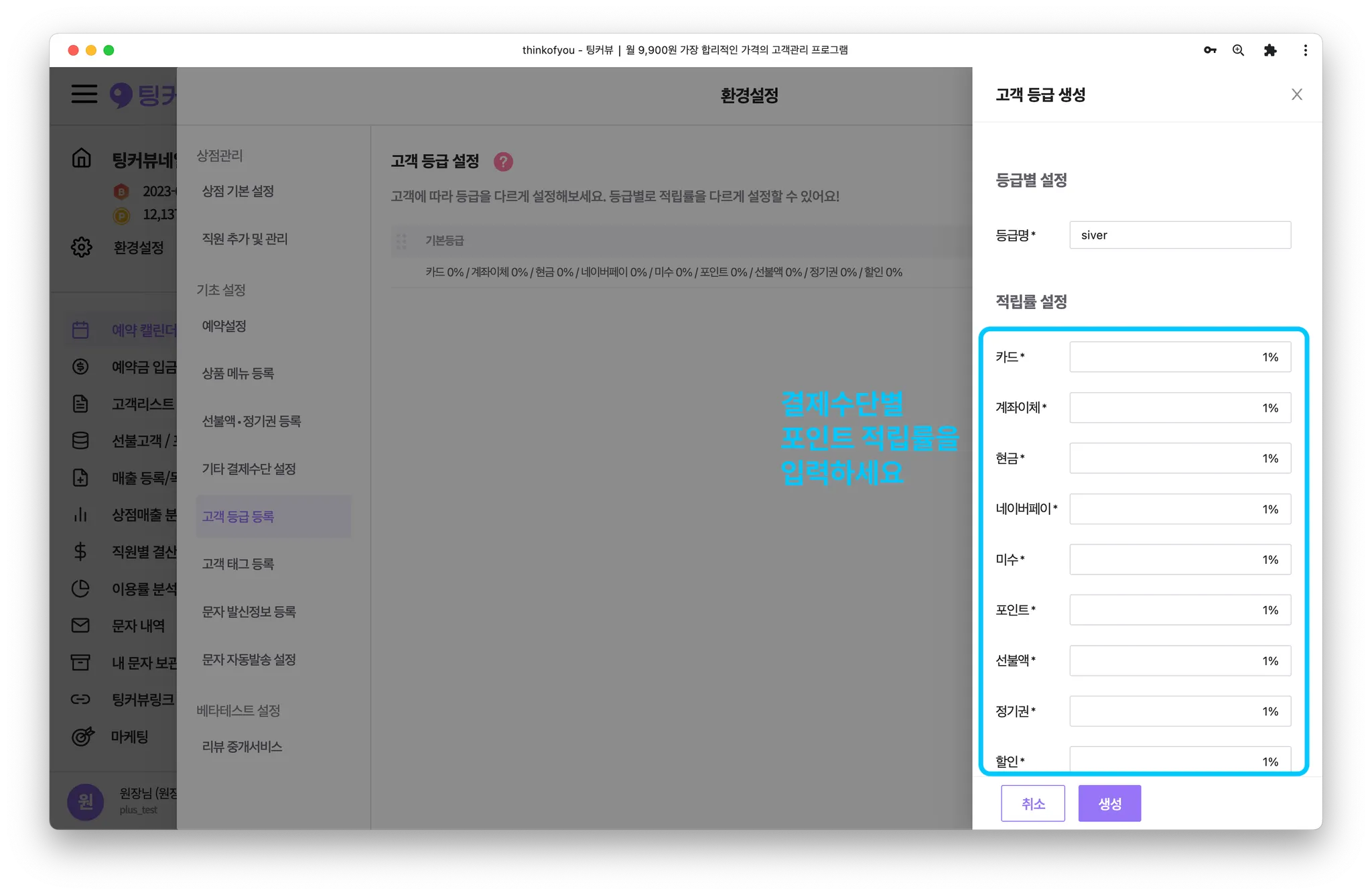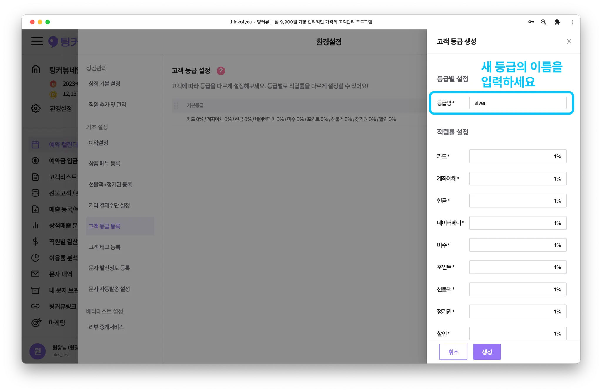 새로 추가할 고객 등급명과 결제수단별 적립률을 입력해주세요.