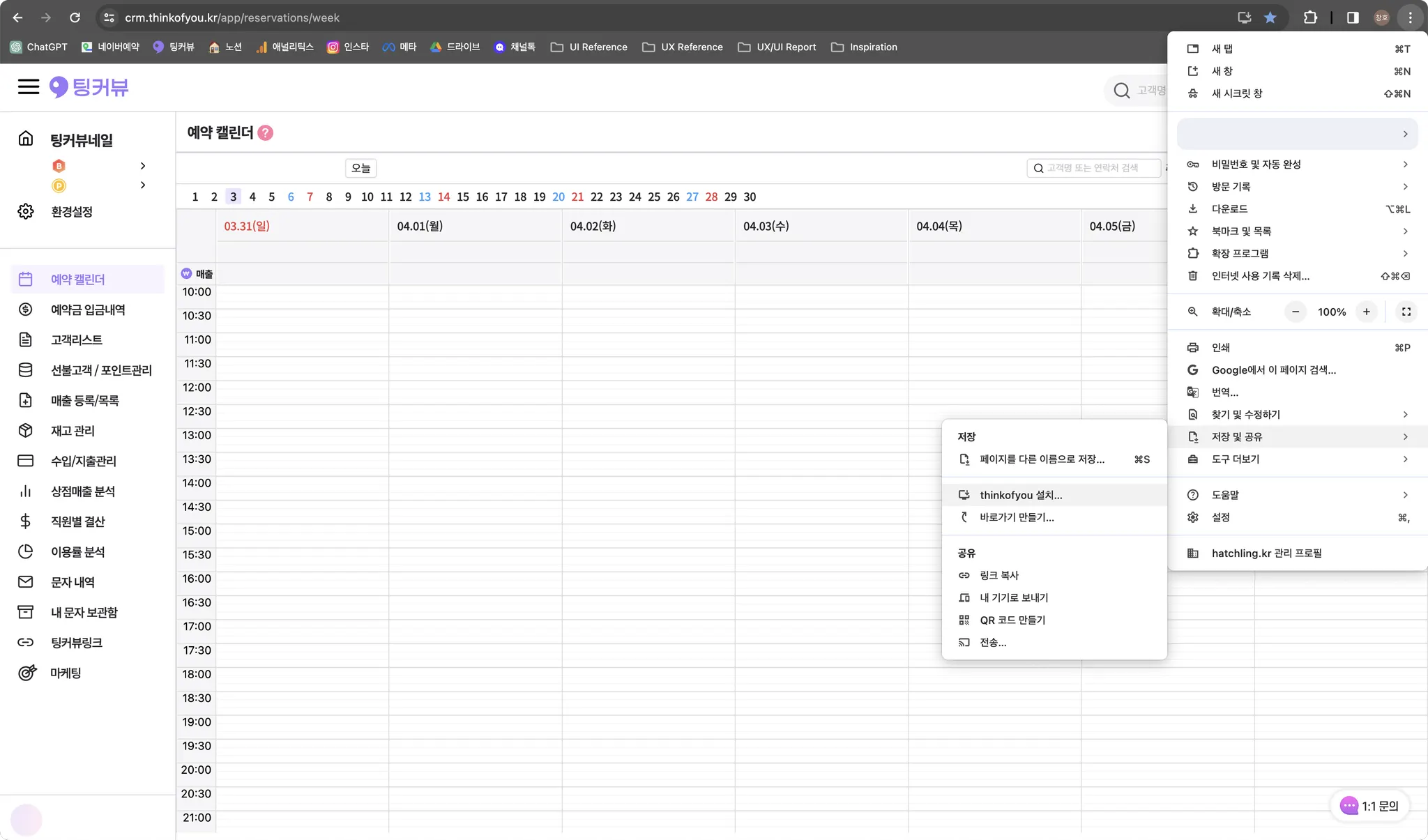 인터넷 창 우측 상단에 ••• 버튼 을 클릭해 저장 및 공유 → 'thinkofyou 설치' 혹은 '바로가기 만들기' 를 선택해주세요.