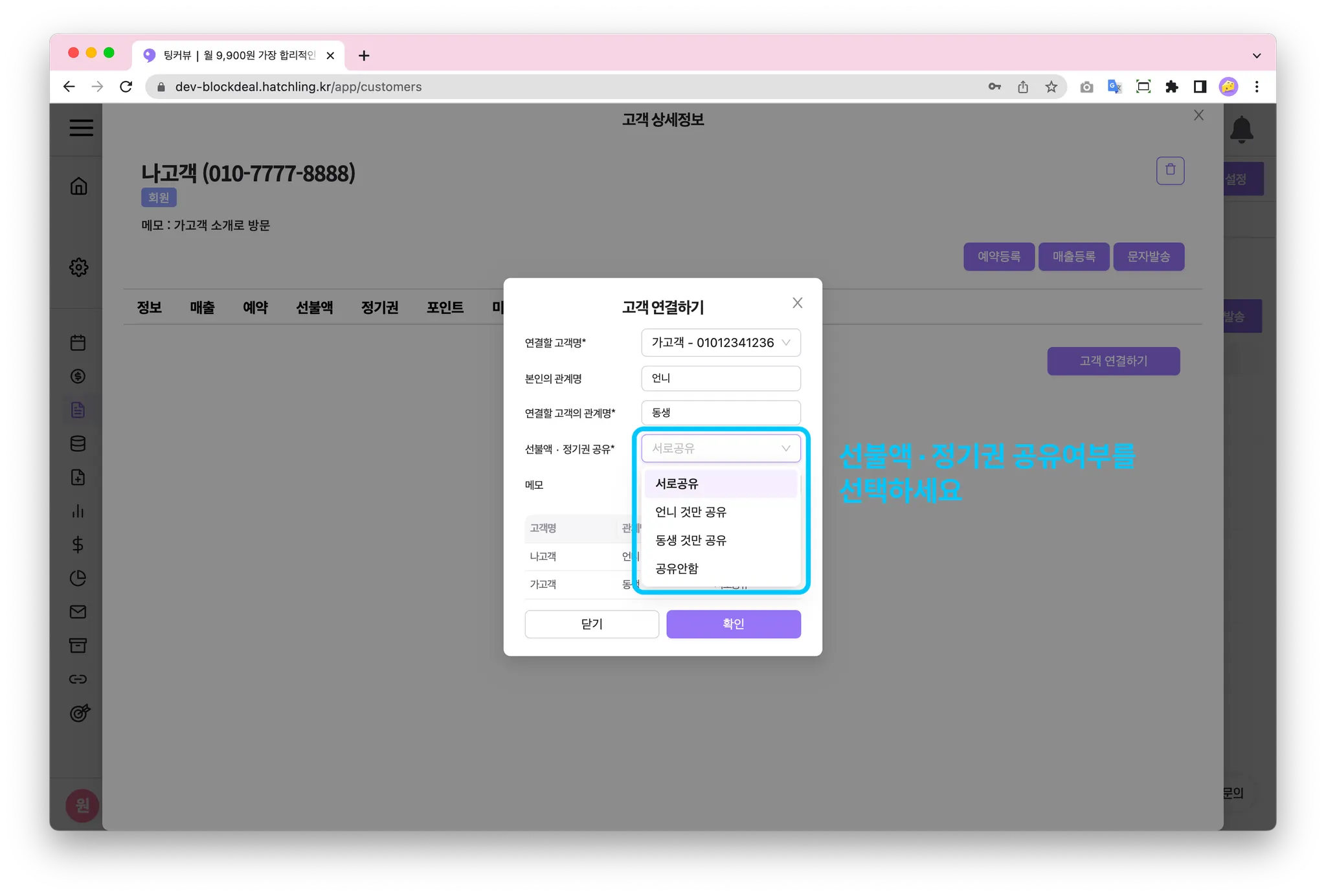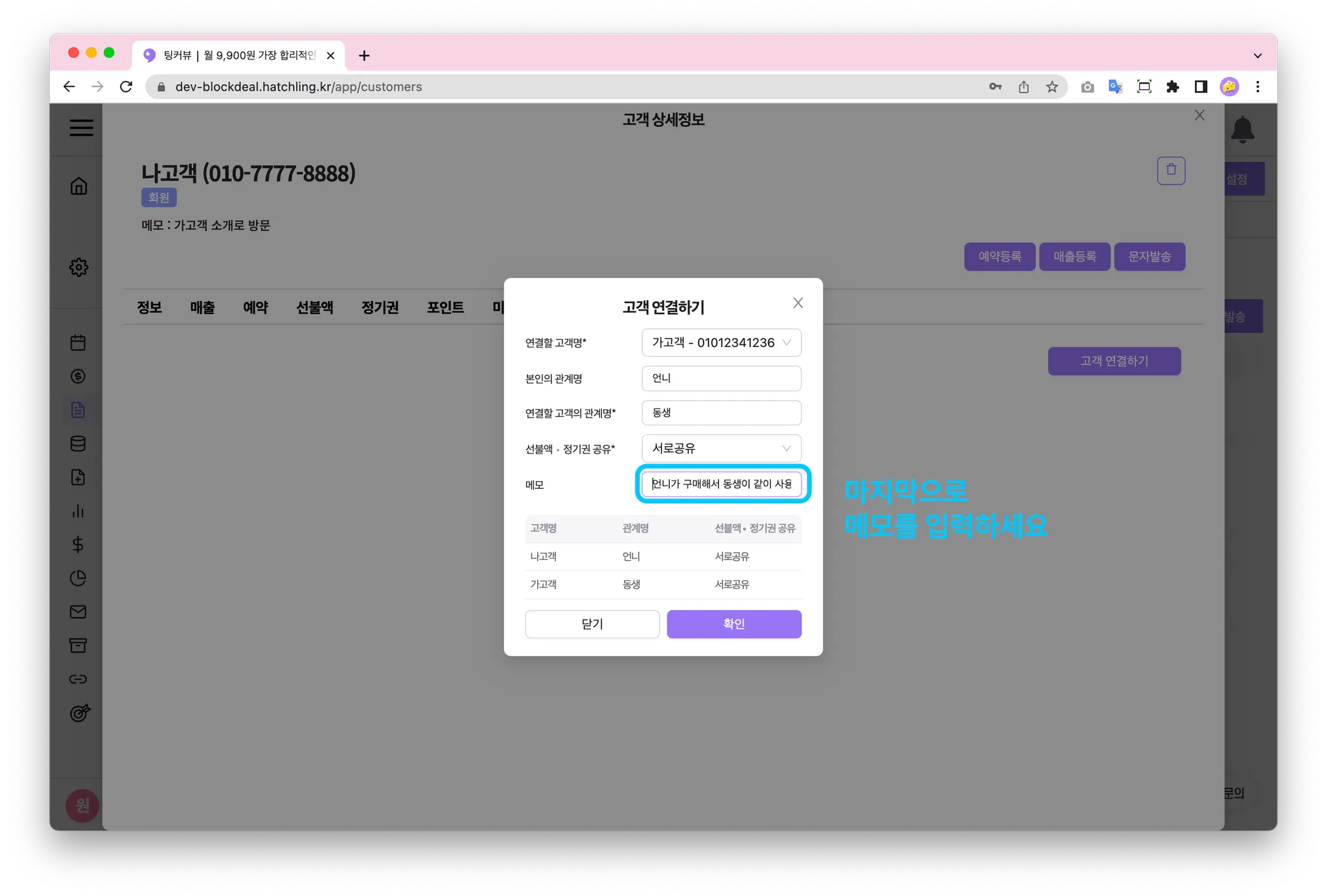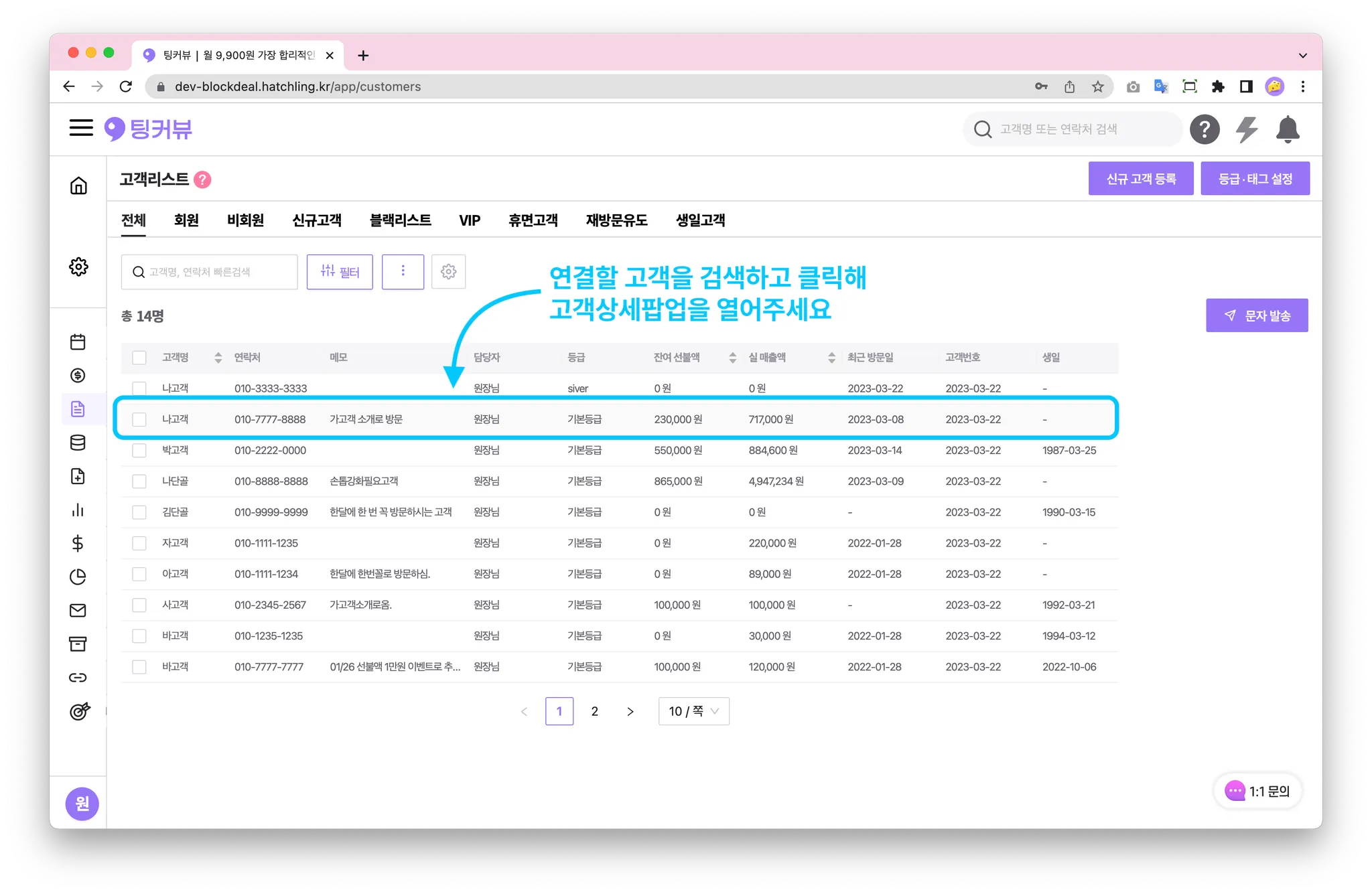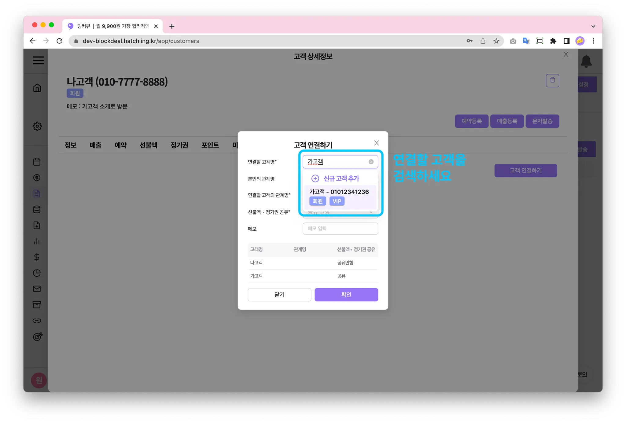 연결할 고객 중 한명을 검색하고 클릭해 고객상세 팝업을 열어주세요!
