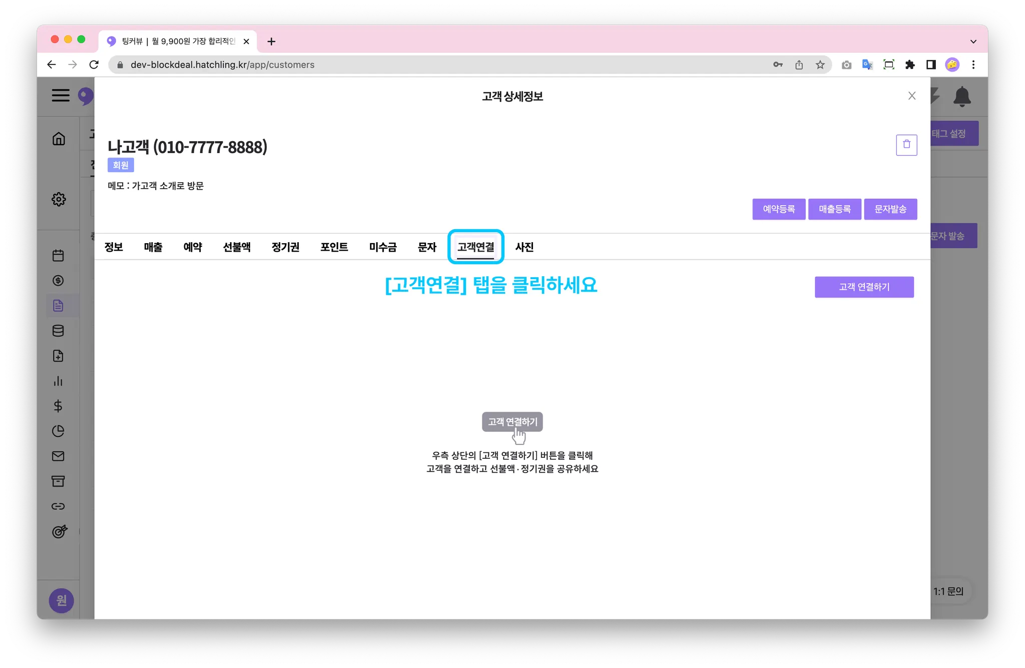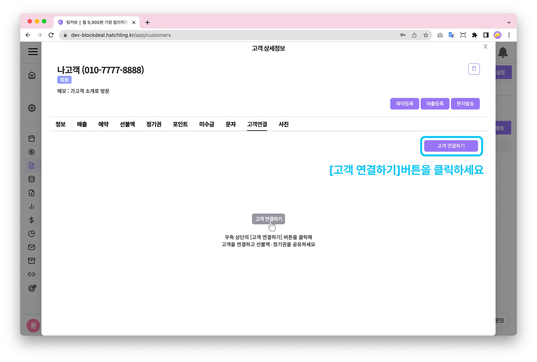 우측 상단의 [고객연결하기] 버튼을 클릭하세요