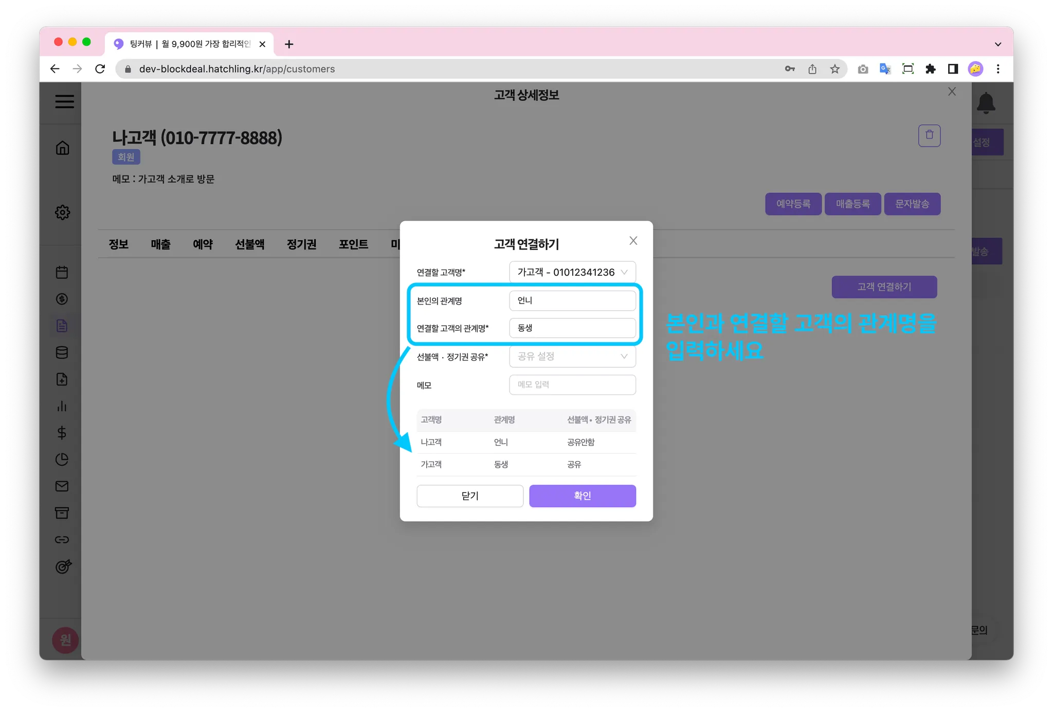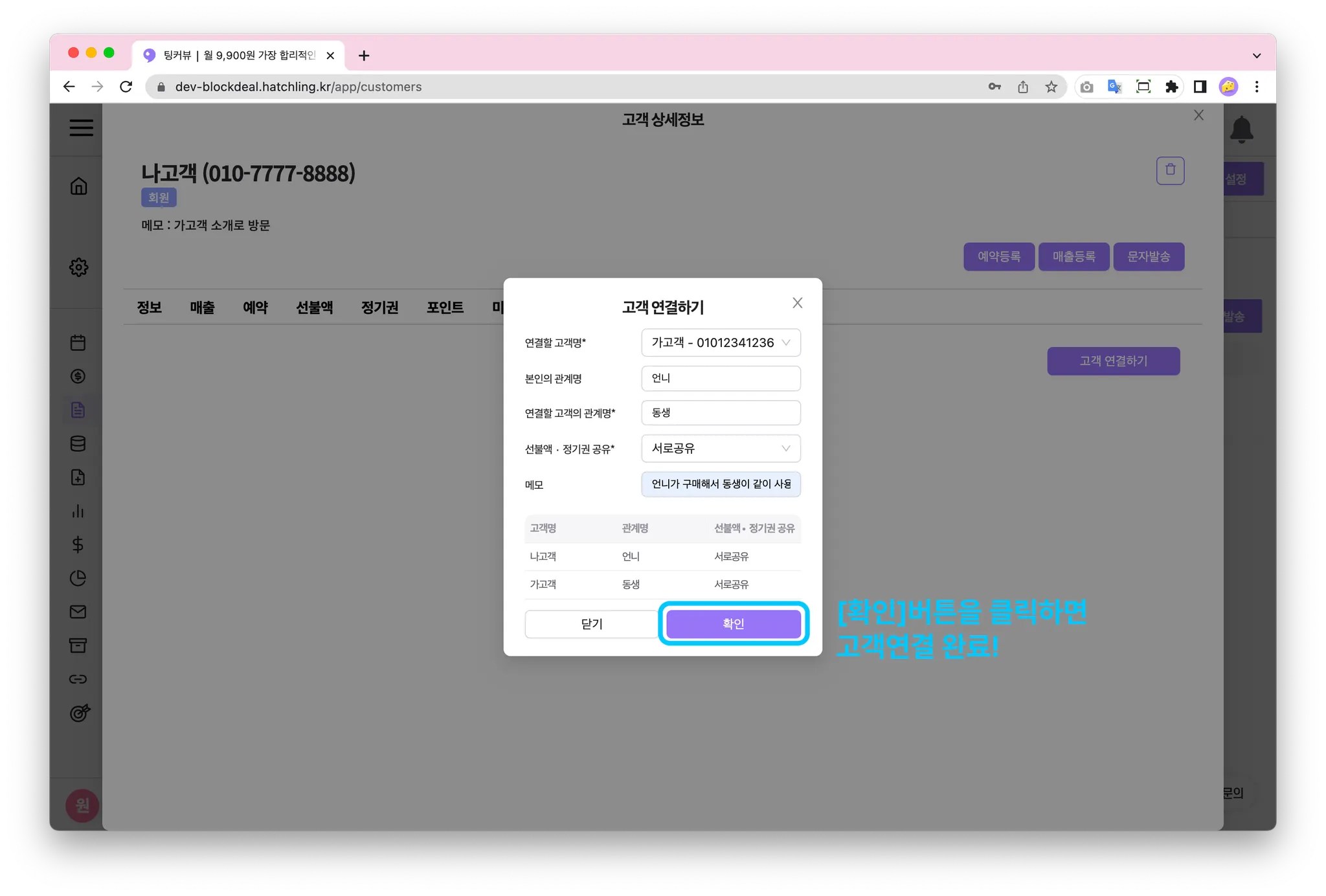 [확인]버튼을 클릭하면 고객연결 완료-!