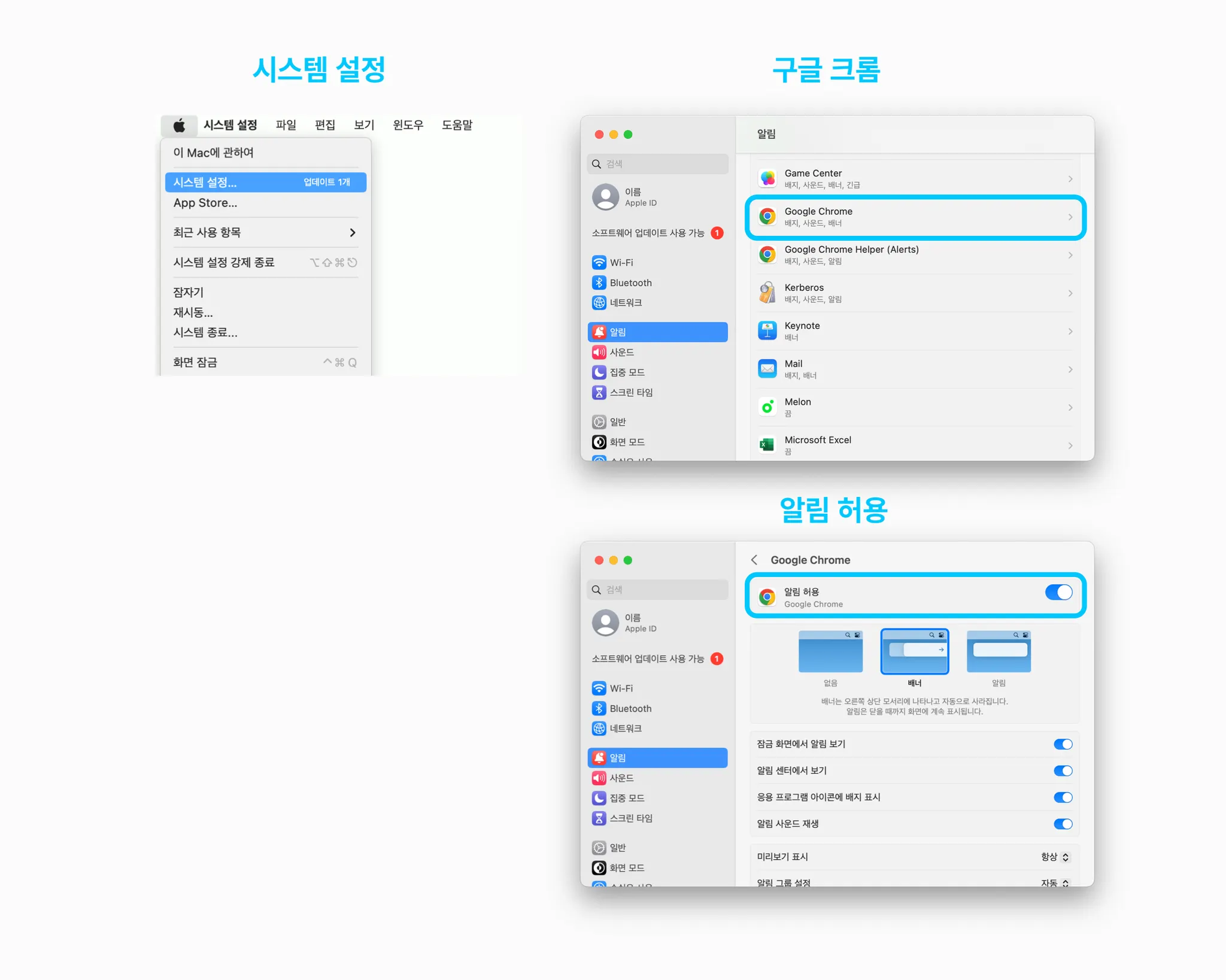 시스템 설정 → 구글 크롬 → 알림 허용