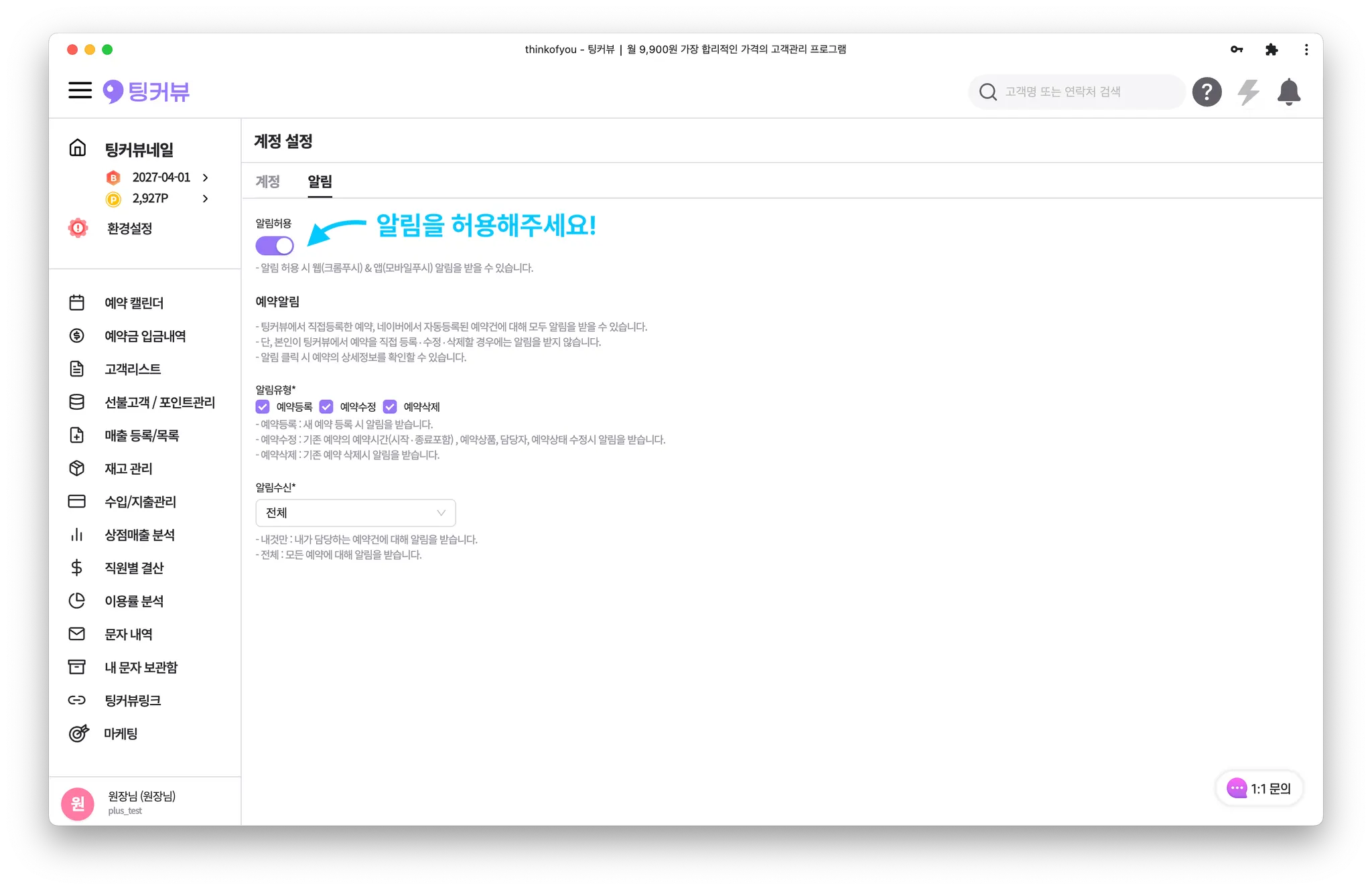 시스템 → 알림 → 알림허용