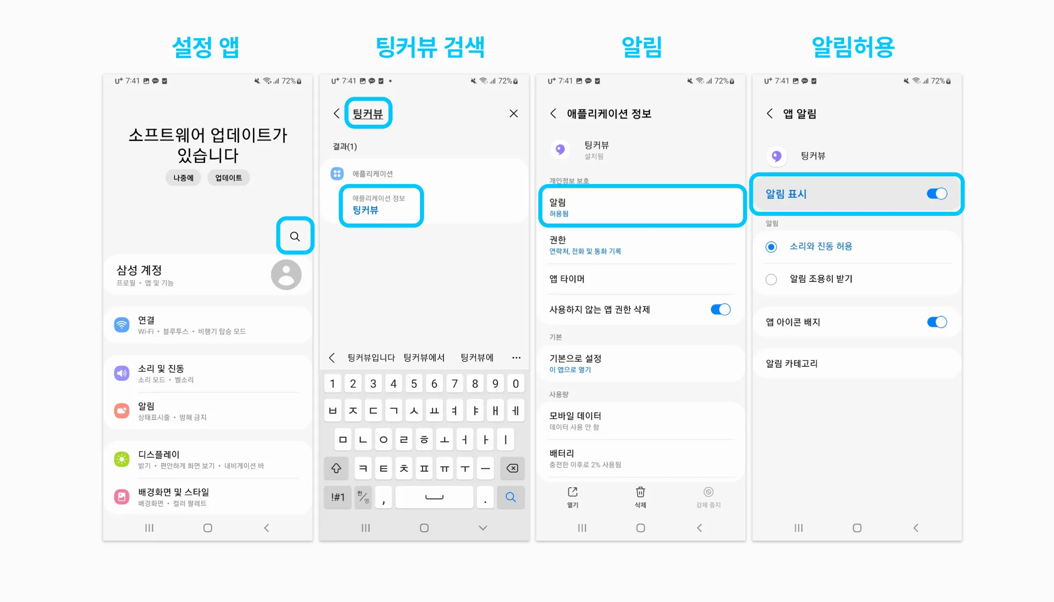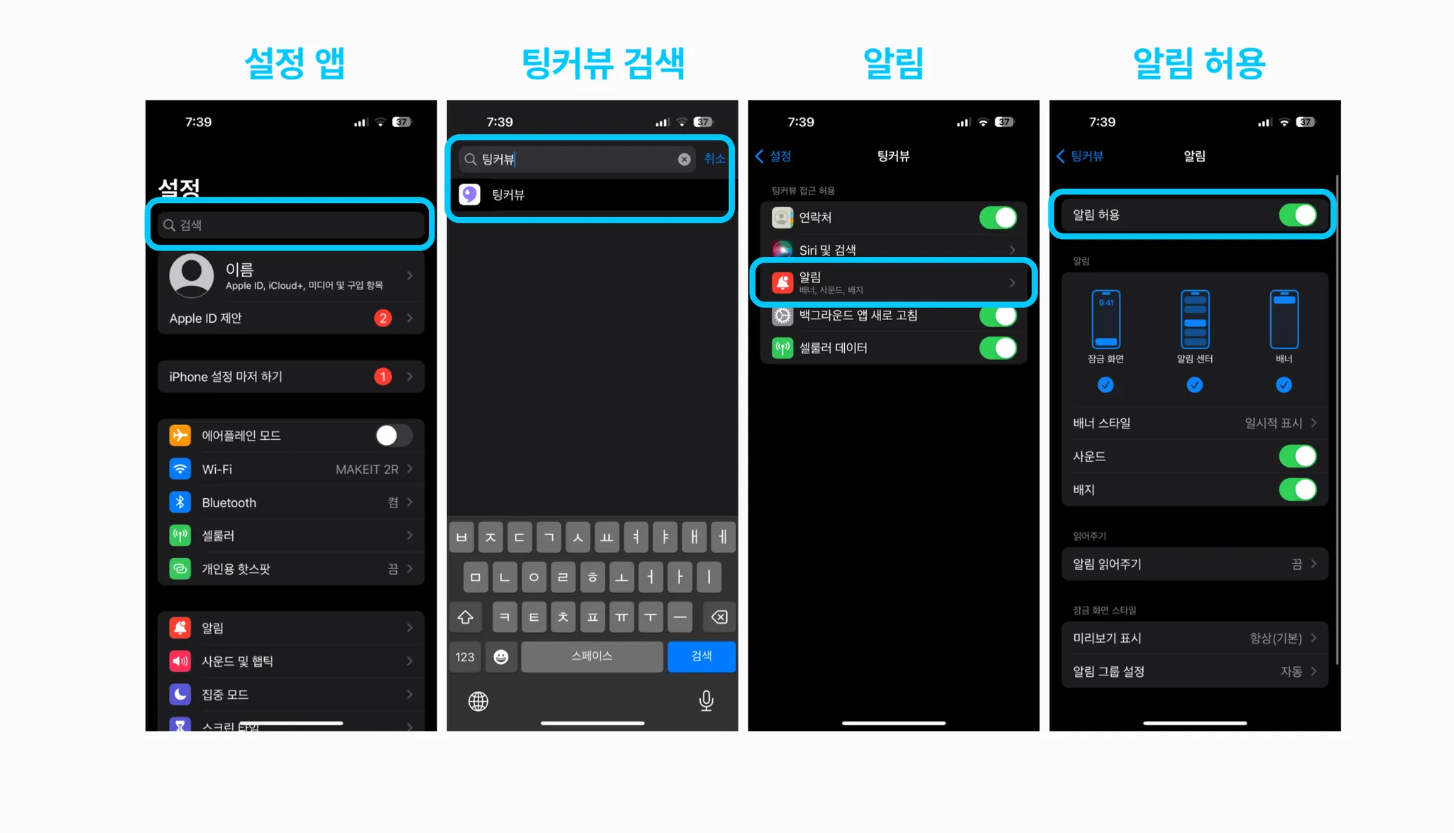 설정 앱 → 팅커뷰 검색 → 알림 → 알림허용