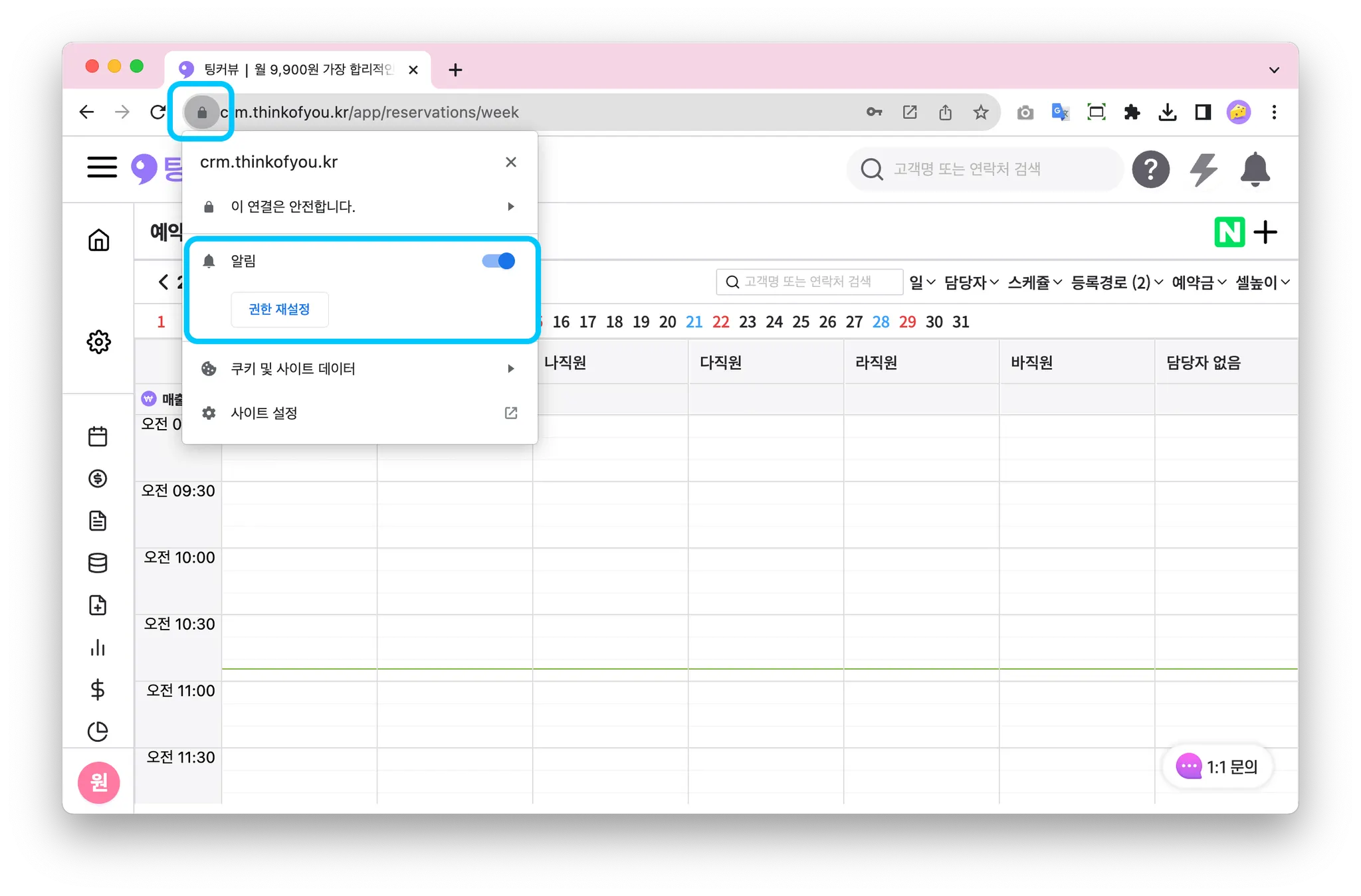 본인을 제외한 직원들이 예약을 등록, 수정, 삭제했을 경우 알림을 받아볼 수 있어요! 모바일앱 푸시와 크롬브라우저 알림을 보내드려요