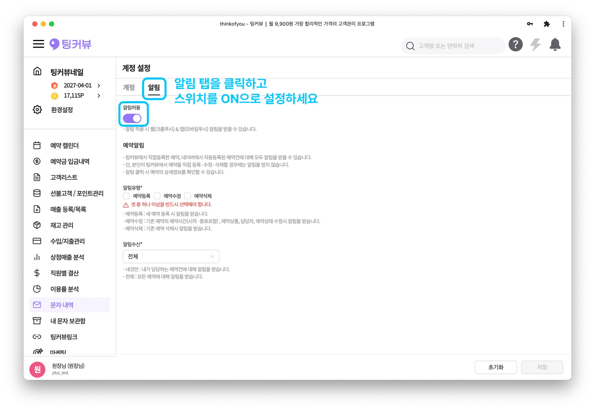 ‘알림’탭을 클릭하고 알림허용 스위치를 ON으로 변경해주세요!