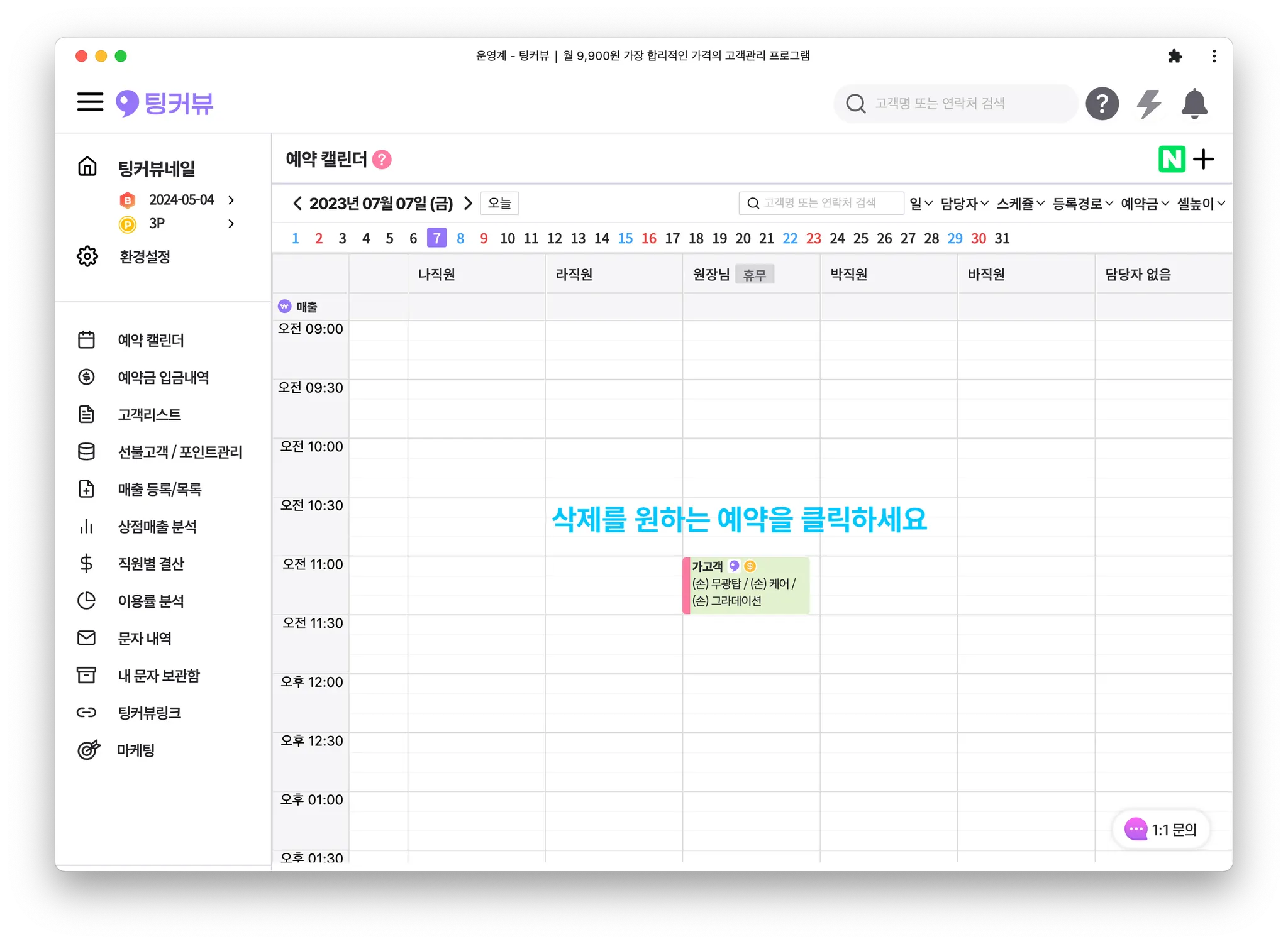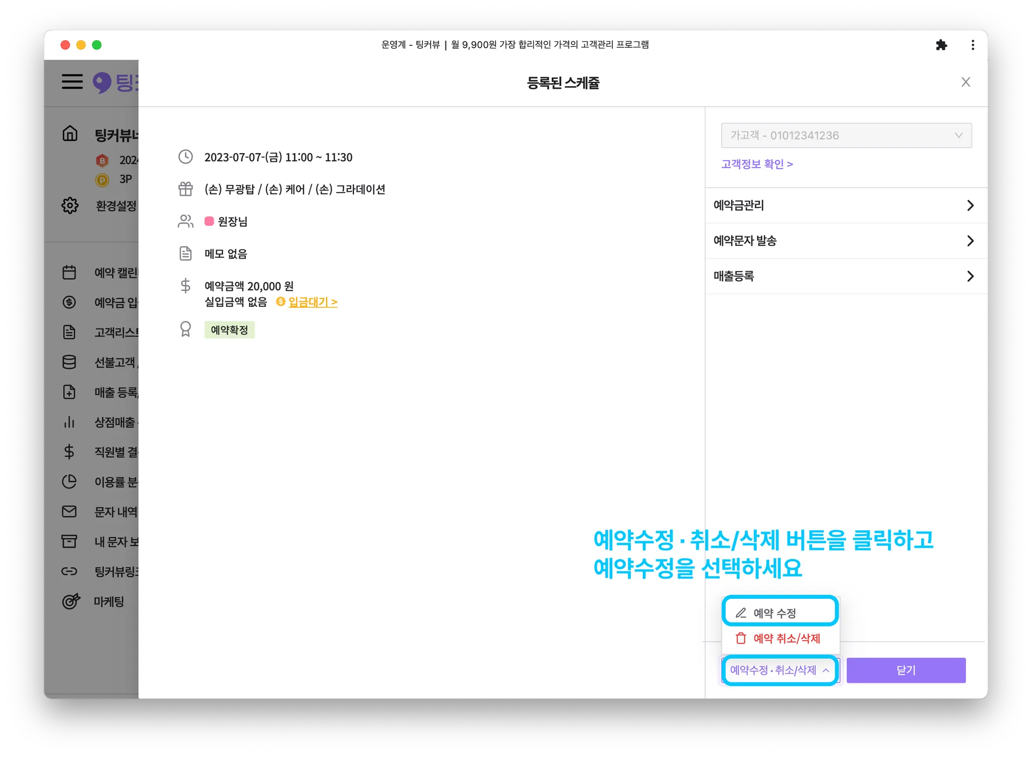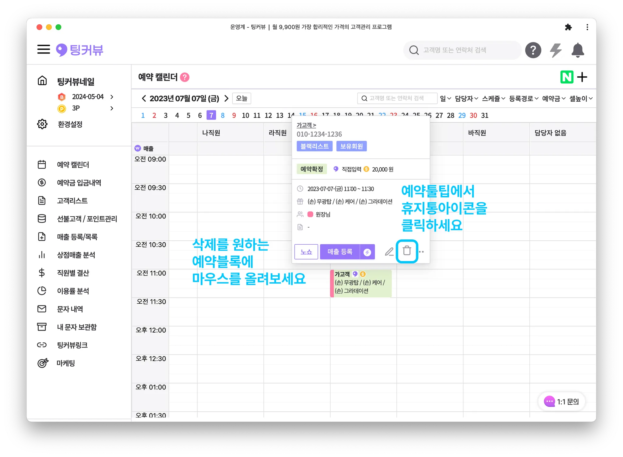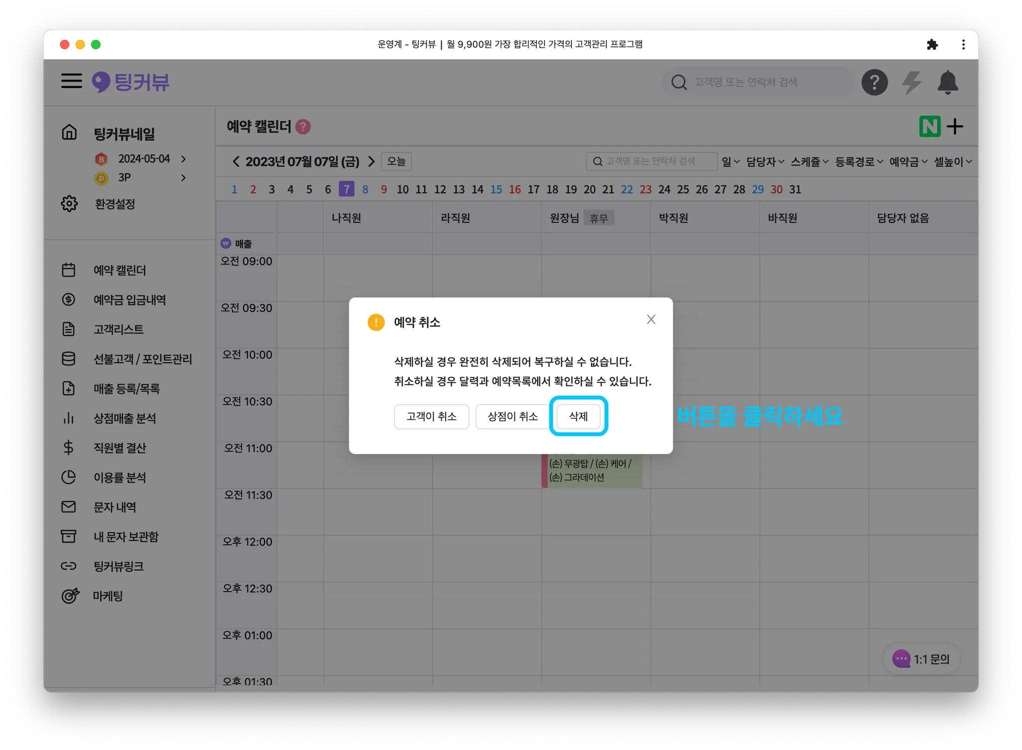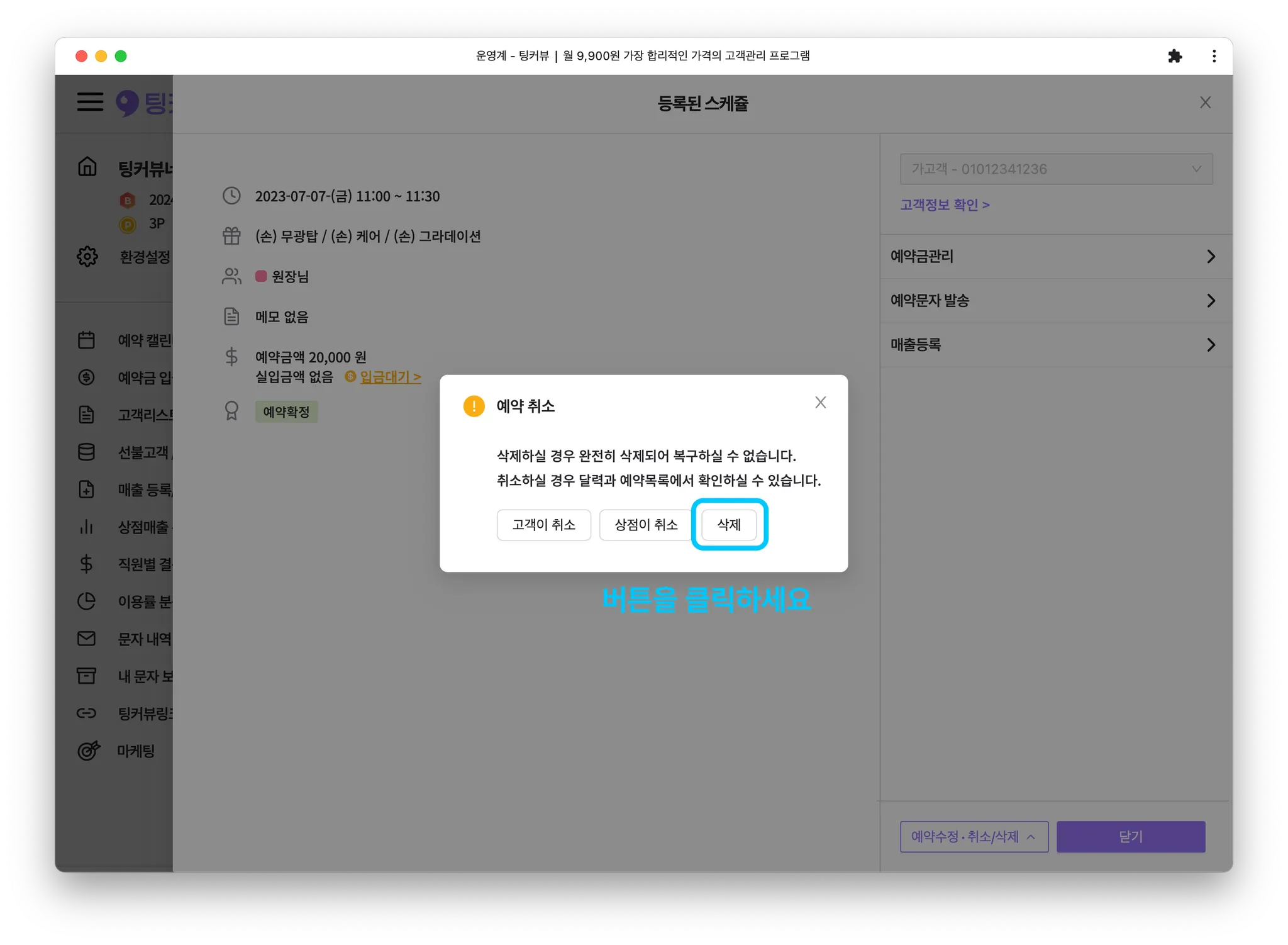 주의! 예약 삭제를 누르면 캘린더에서 예약이 완전히 사라집니다. 고객이 취소, 상점이 취소 버튼을 클릭하면 예약이 취소되며, 캘린더에 사라지지 않고 예약취소 상태로 유지됩니다.