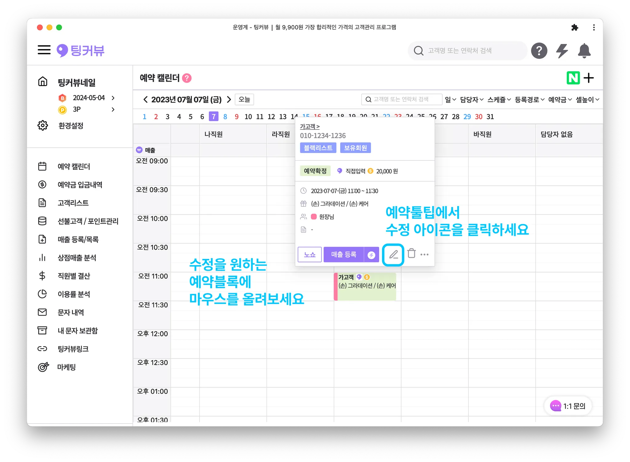 수정을 원하는 예약블록에 마우스를 올려보세요. 예약툴팁창이 보이면 [수정아이콘] 을 클릭해주세요.