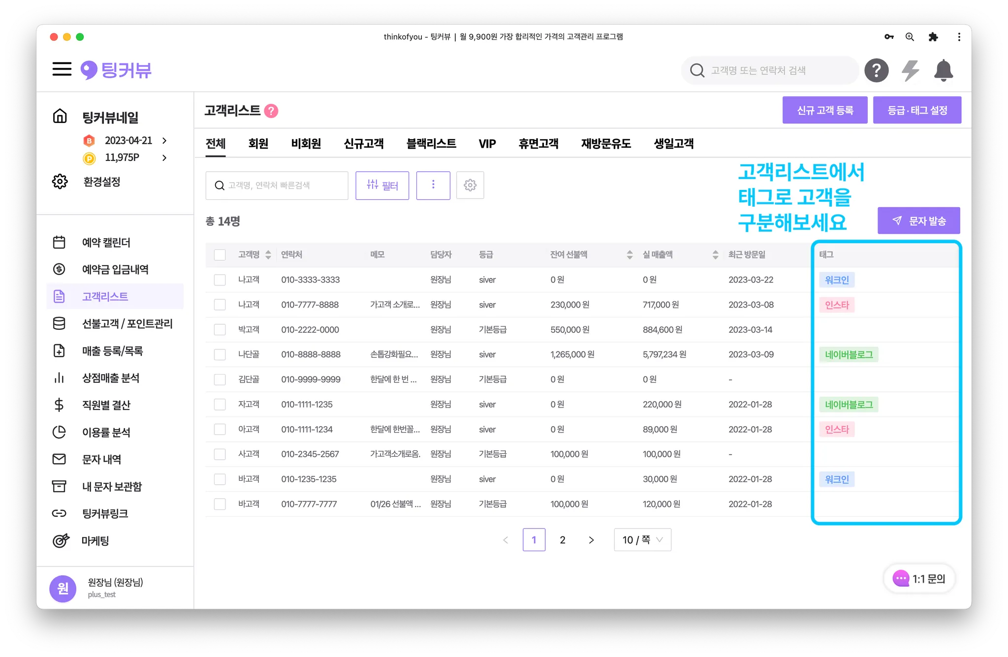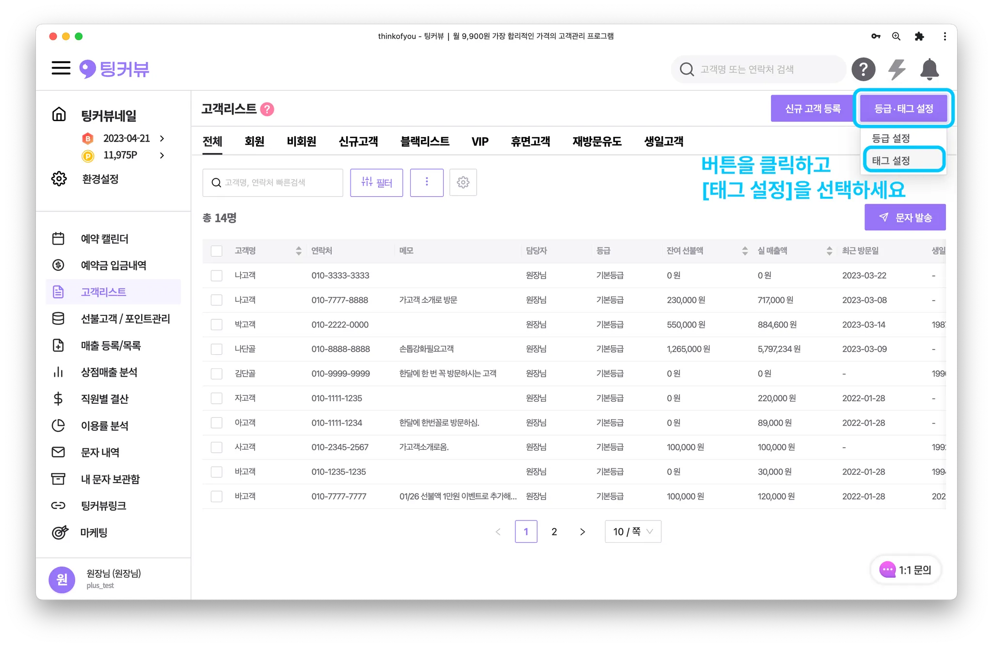 태그설정을 완료했다면, 이제 고객을 태그로 분류할 차례에요! 태그를 이용하면, 고객리스트에서 태그로 고객을 구분할 수 있어요!